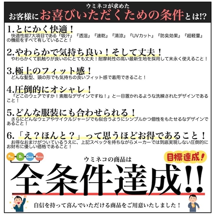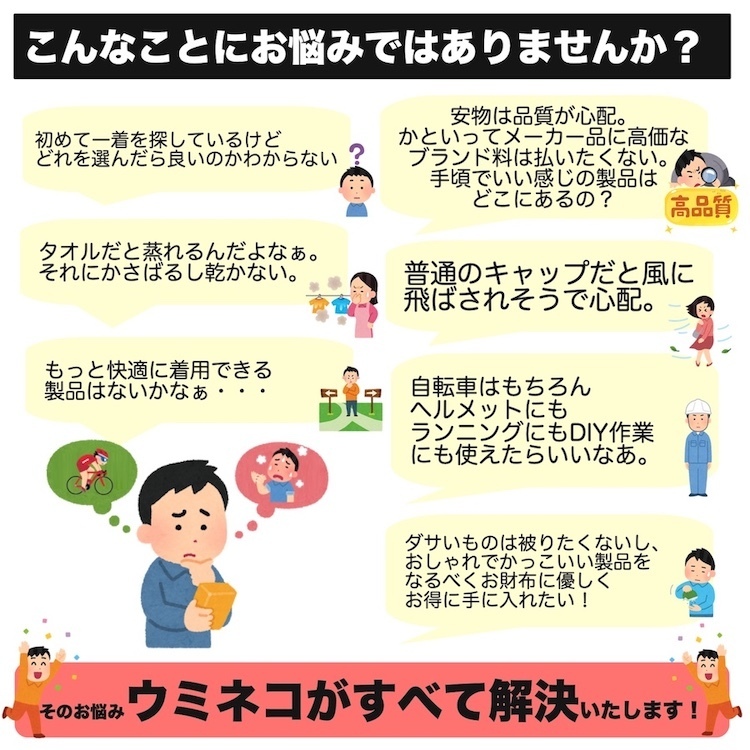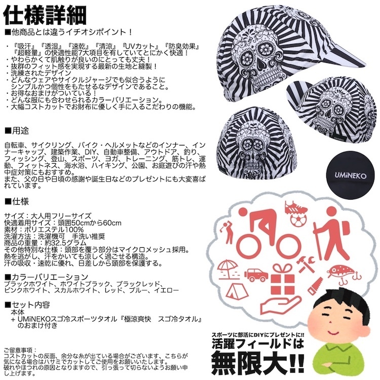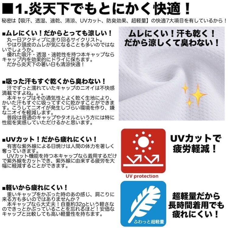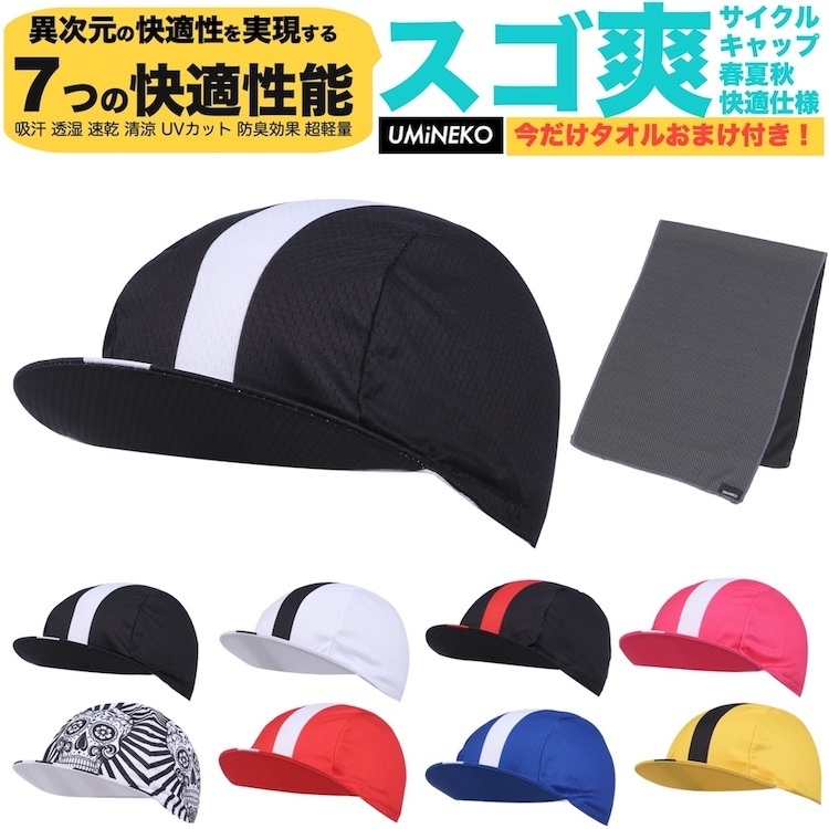| ■■■店長のコメント■■■ ■ウミネコが求めたお客様にお喜びいただくための条件とは!? 1.とにかく快適! 快適性能7大項目である『吸汗』『透湿』『速乾』『清涼』『UVカット』『防臭効果』『超軽量』の機能をすべて有していること! 2.やわらかで気持ち良い!そして丈夫! やわらかくて肌触りが良いのにとても丈夫! 耐摩耗性の高い最新生地を採用して末永く使えること! 3.極上のフィット感! どんな髪型、頭の形でも気持ちの良いフィット感で着用できること! 4.圧倒的にオシャレ! 『どこのウェアですか!素敵なデザインですね!』と一目置かれるような洗練されたデザインであること! 5.どんな服装にも合わせられる! さらにどんなウェアやサイクルジャージでも似合うようにシンプルかつ個性をもたせるなデザインであること! 6.「え?ほんと?」って思うほどお得であること! お得なおまけがついているうえに、上記スペックを持ちながらメーカーでは到底実現しない圧倒的にお財布に優しい価格であること! ウミネコの商品は全条件達成!! 自信を持って喜んでいただける商品をご用意いたしました! ■炎天下でもとにかく快適 秘密は【吸汗、透湿、速乾、清涼、UVカット、防臭効果、超軽量】の快適7大項目を有しているから! 【ムレにくい!だからとっても涼しい!】 丸一日アクティブに走り回るサイクリスト。 やはり頭皮のムレが気になることも多いのではないでしょうか。 優れた吸汗・透湿・速乾性を持つ本キャップならキャップ内を効果的にドライに保ちます。 だから炎天下の暑い日も清涼快適! 【吸った汗もすぐ乾くから臭わない!】 汗でずっと濡れていたキャップのニオイは不快感満載ですよね。。。 本キャップはその通気性とよく乾く生地により、かいた汗もすぐに吸ってすぐに乾かすことができます。こうしてニオイが発生しづらい環境を作り、嫌なニオイを軽減します。 普段は普通のキャップやタオルという方には特に 性能を実感していただけるかと思います。 【UVカット!だか疲られにくい!】 有害な紫外線による日焼けは人間の体力を著しく奪っていきます。 UVカット機能を持つ本キャップなら着用するだけで紫外線をカットでき、紫外線に由来する疲労を大幅に軽減することができます。 【軽いから疲れにくい!】 重いキャップをかぶった時のあの感じ、肩こりに来る方も多いのではありませんか? 本キャップなら大丈夫! 自重約32gという軽さなのできっとかぶっていることを忘れるほど!安価なキャップと比較しても高い軽量性を持ちます。 ■やわらかで気持ち良い!そして丈夫! 「毎日使いたい!」そう思ってほしいから「肌触りの良さ」と「丈夫さを」追求しました! 最新の技術はすごいんです! やわらかくて肌触りが良いのにとても丈夫なんです! ウミネコのキャップは機能性と快適性を兼ね備えた最新のマイクロメッシュ生地を採用しています。 耐摩耗性も高く末永く使うことができますよ! ■極上のフィット感!これほんと大事! 「あーこれは気持ちよくフィットしてる!」 やっぱりブカブカやキツキツだと、頭がなんだか気になっちゃって集中できないから嫌ですよね。 本キャップはフリーサイズなのでどんな髪型、頭の形でも自分だけの気持ちの良いフィット感で着用できます! 他のキャップとは違う最新の生地と工夫した縫製による洗練されたフィット感をぜひ体感してみてください! ■シュッと痩せ見えシルエットがオシャレ! 独自の縫製で360°どこから見てもシュッと痩せて見える洗練されたシルエット。 どんなスポーツウェアやサイクルジャージでも合うようにシンプルかつ個性をもたせるよう仕上げました! きっとお気に入りいただけると思います! どこのキャップですか?と聞かれたら「ウミネコのキャップです」と おこ答えくださいね! ■今だけお得なおまけ付き! 水に濡らして振るだけカンタン!! 【極涼爽快 スゴ冷 やわらか冷感スポーツ・トレーニング タオル】 今だけ購入者様全員にこちらを1枚プレゼント! ウミネコの新製品ぜひぜひお試しくださいませ! イチオシポイント: ・驚異の気化冷却!瞬間冷却で速攻15度!極上の清涼体験! ・やわらかくて肌触りが良いのにとても丈夫! ・研究された使いやすいサイズ感 用途: スポーツ、ヨガ、トレーニング、筋トレ、運動、フィットネス、スケボー、スケート、インラインスケート、自転車、サイクリング、バイク、建築作業、DIY、アウトドア、釣り、フィッシング、登山、ハイキングの吸汗や熱中症対策におすすめです! ■他商品とは違うイチオシポイント ・『吸汗』『透湿』『速乾』『清涼』『UVカット』『防臭効果』『超軽量』の快適性能7大項目を有していてとにかく快適! ・やわらかくて肌触りが良いのにとっても丈夫! ・抜群のフィット感を実現する最新の生地と縫製! ・洗練されたデザイン ・どんなウェアやサイクルジャージでも似合うようにシンプルかつ個性をもたせるなデザインであること。 ・お得なおまけがついている! ・どんな服にも合