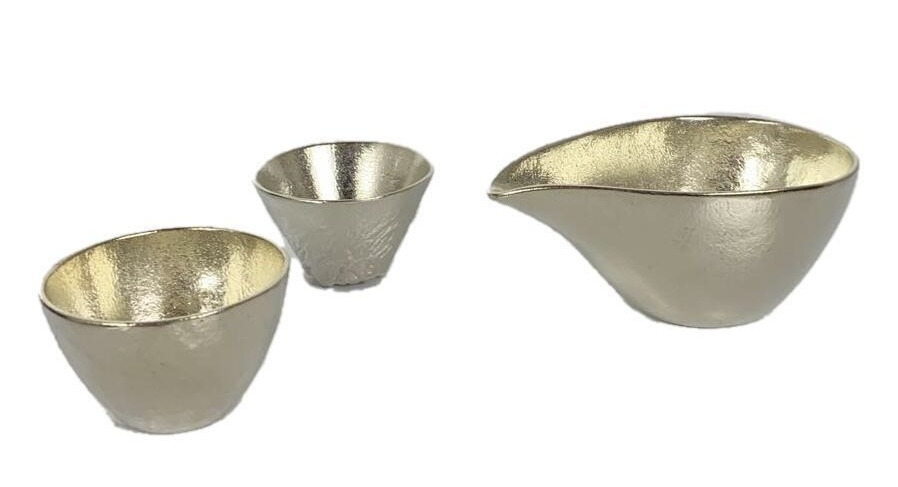 【商品内容】 能作 酒器セット 立山の片口と夫婦ぐい呑み3点セット 錫製 未使用品です。 【サイズ㎜ 】 ●夫婦ぐい呑み L : 高さ43 直径69 75cc、S : 高さ40 直径63 50cc ●片口 大 高さ65 長さ158 幅101 365cc ※桐箱入りで使用せず自宅保管しておりました。 Nousaku sake set, Tateyama katakuchi and pair of sake cups, 3-piece set, made of tin, unused. ※詳細は写真をご覧いただき宜しくお願い致します。 ※送料は定形外郵便またはゆうパック60サイズで、出来るだけ安価となるよう梱包しお知らせいたします。