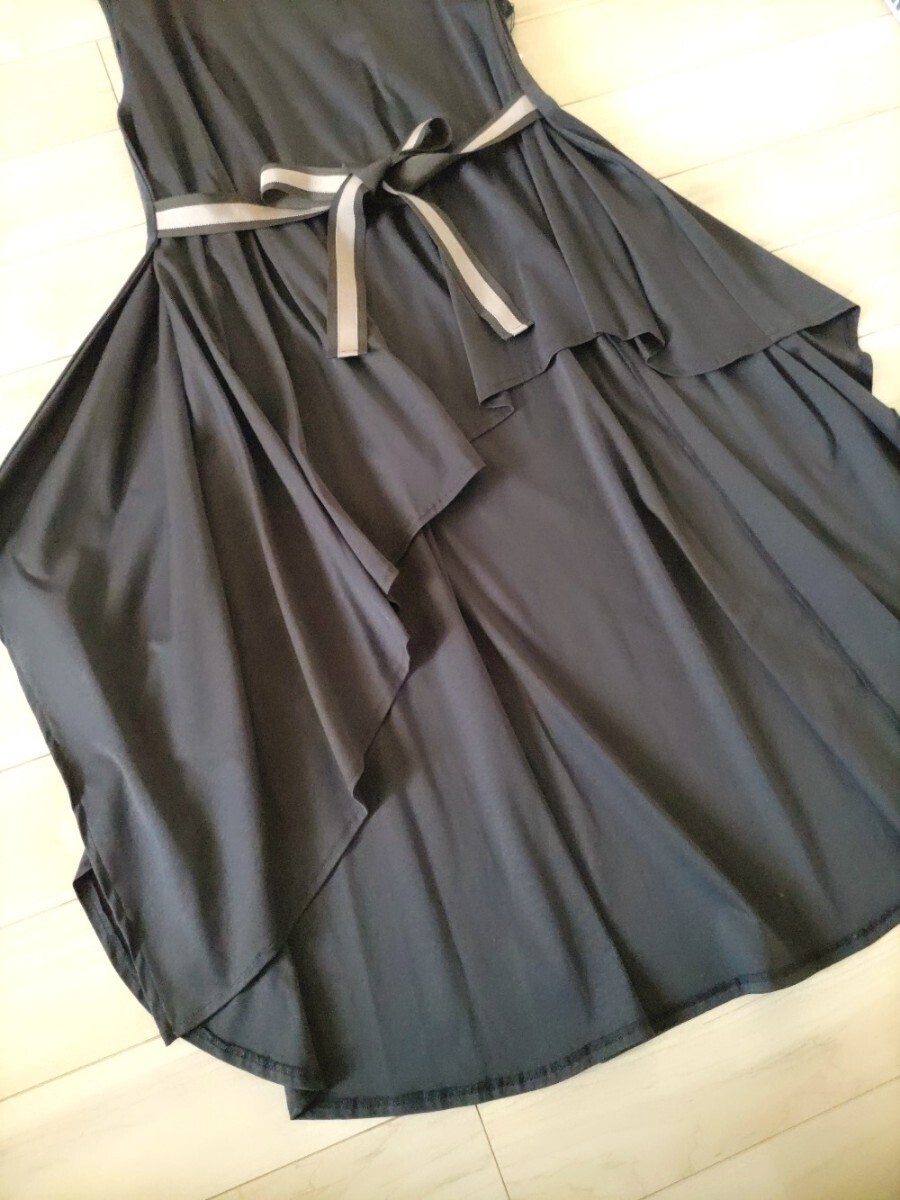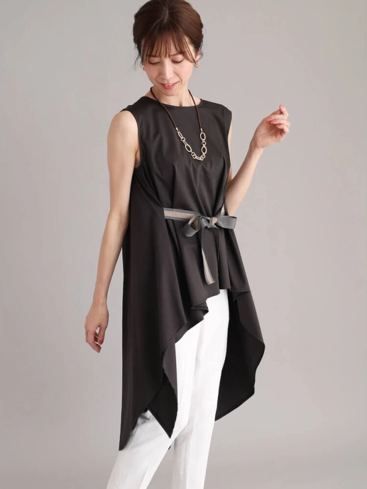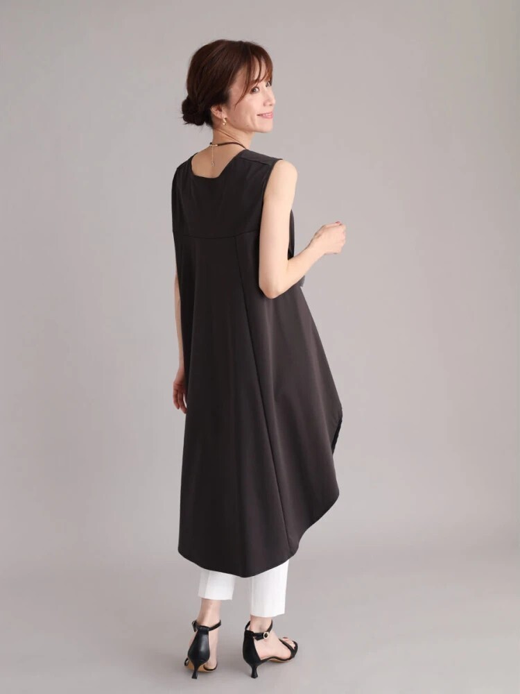 前後差のあるヘムラインはドレープ調になっており動きに合わせて裾が揺れ、軽やかな印象に◎