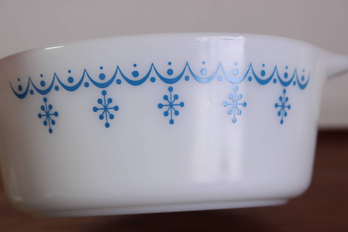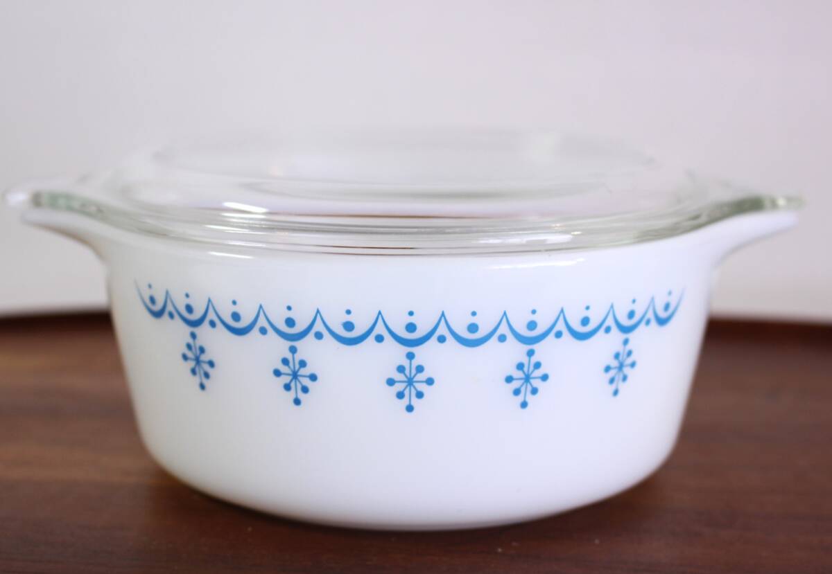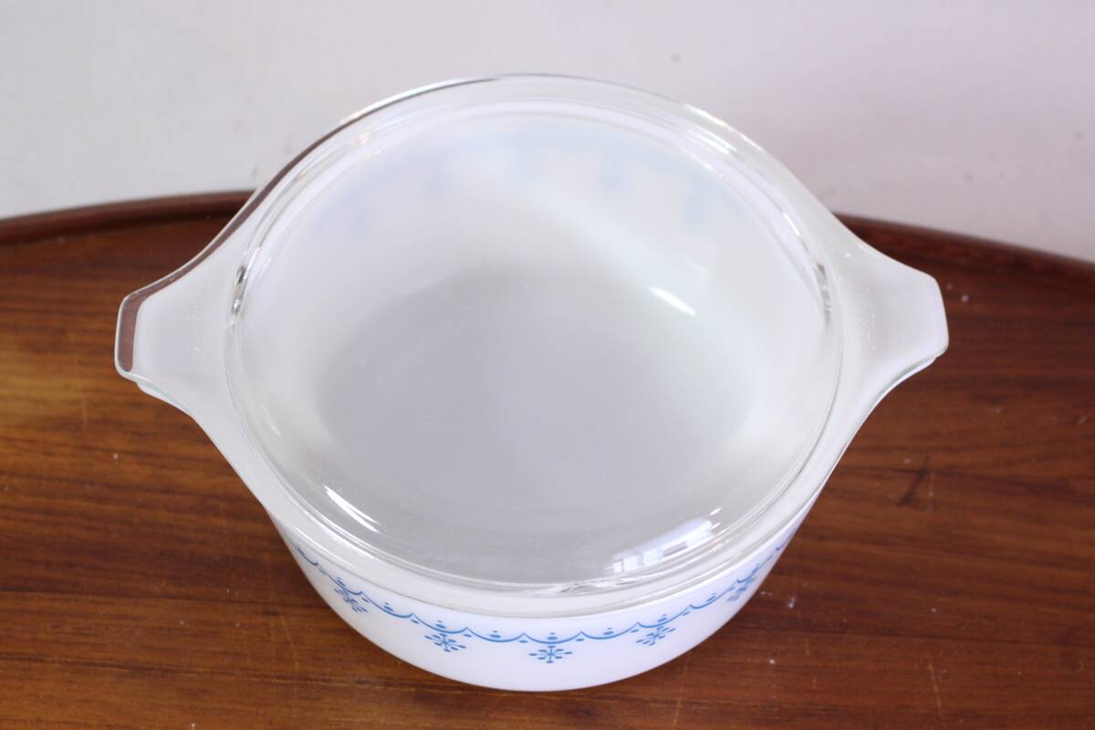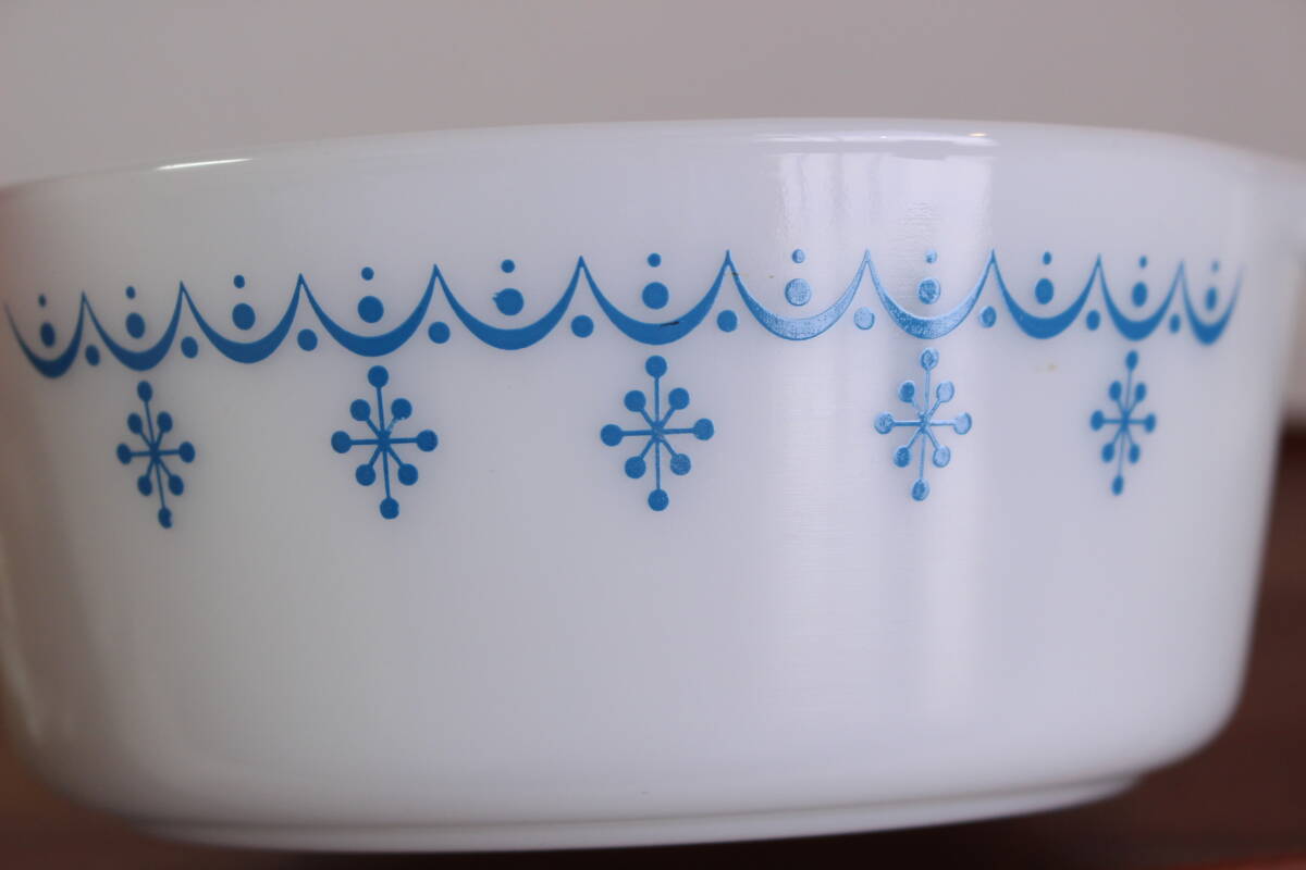 オールドパイレックスのホワイトにブルーの雪の結晶がプリントされたスノーフレークの、蓋付キャセロールです。