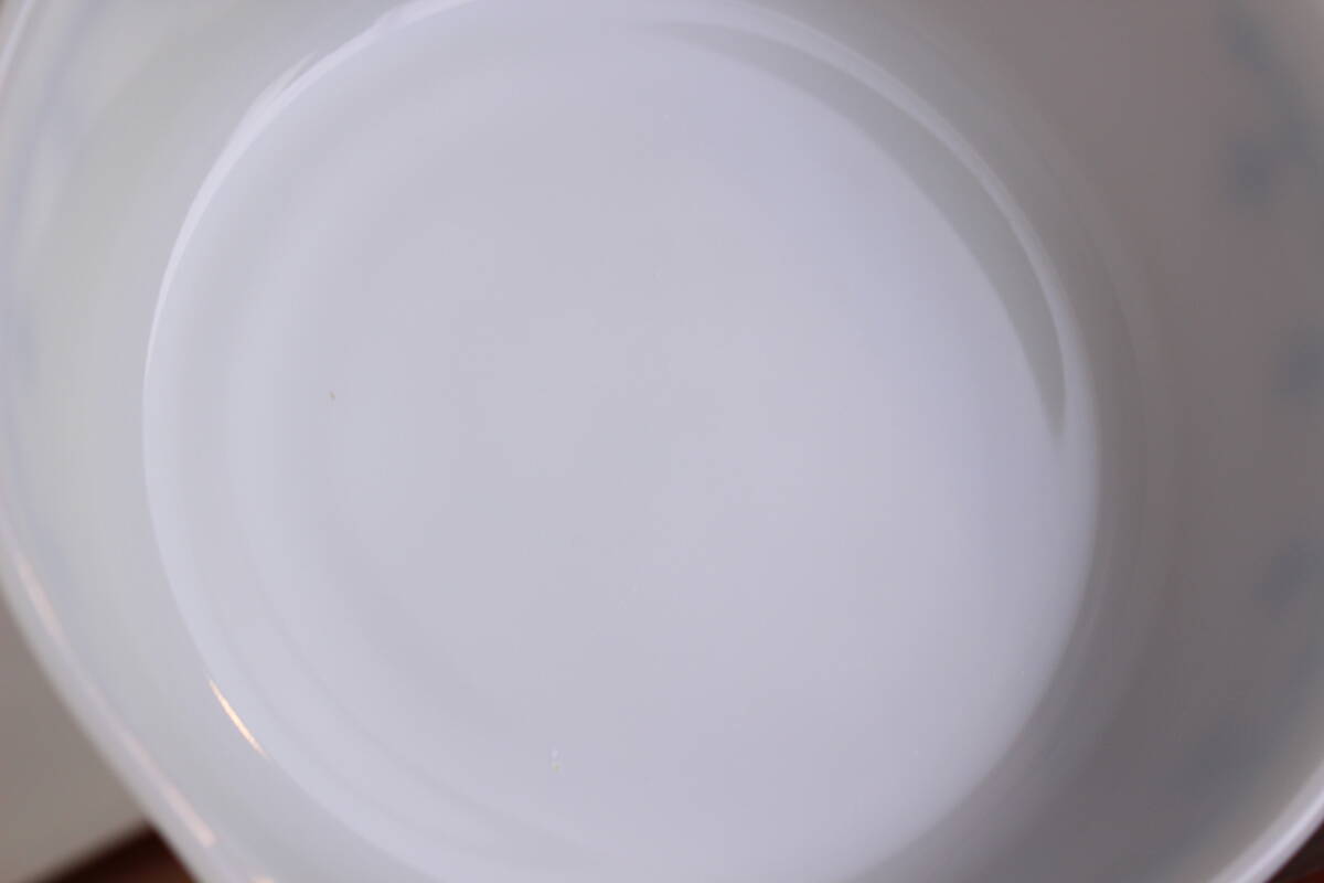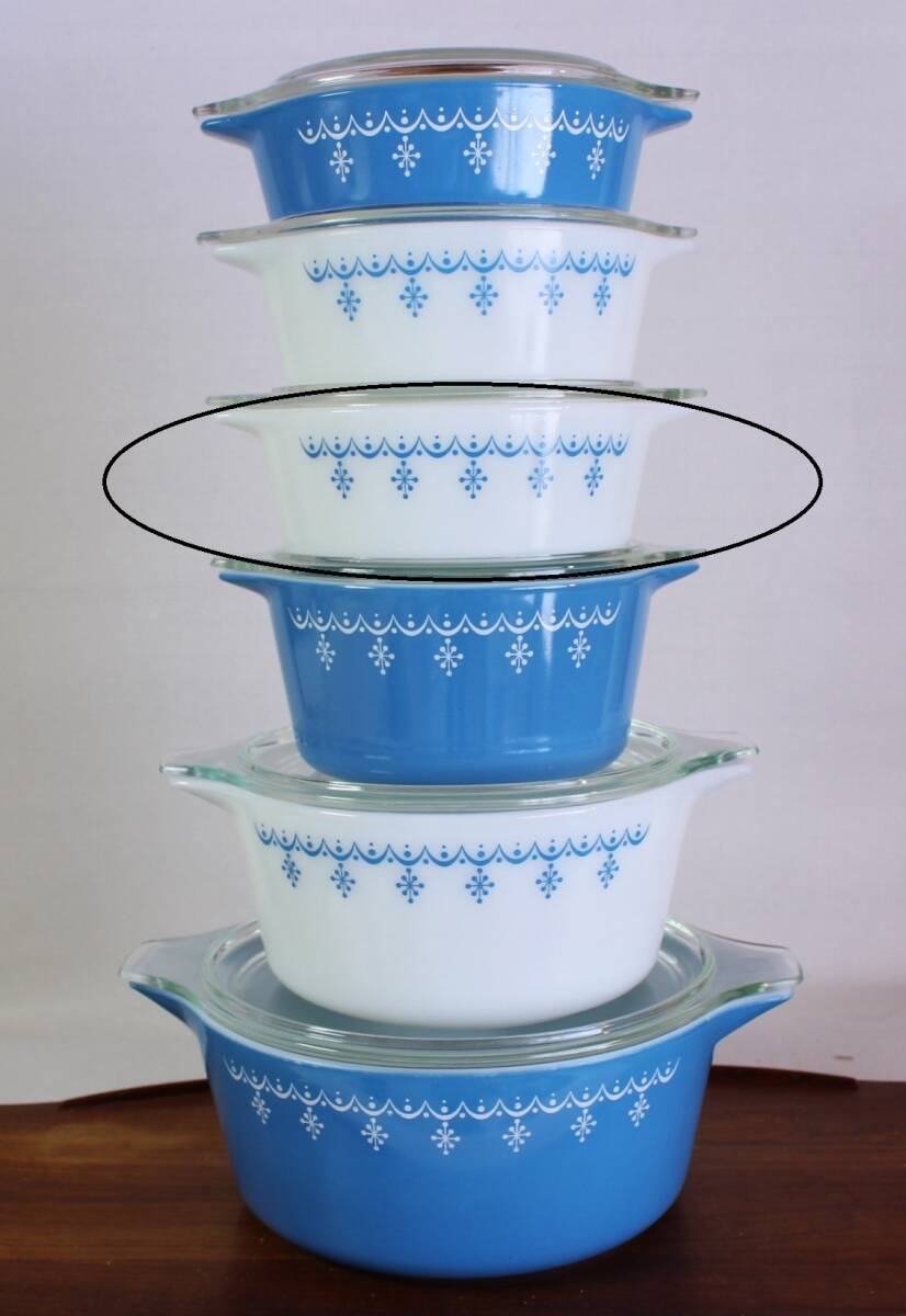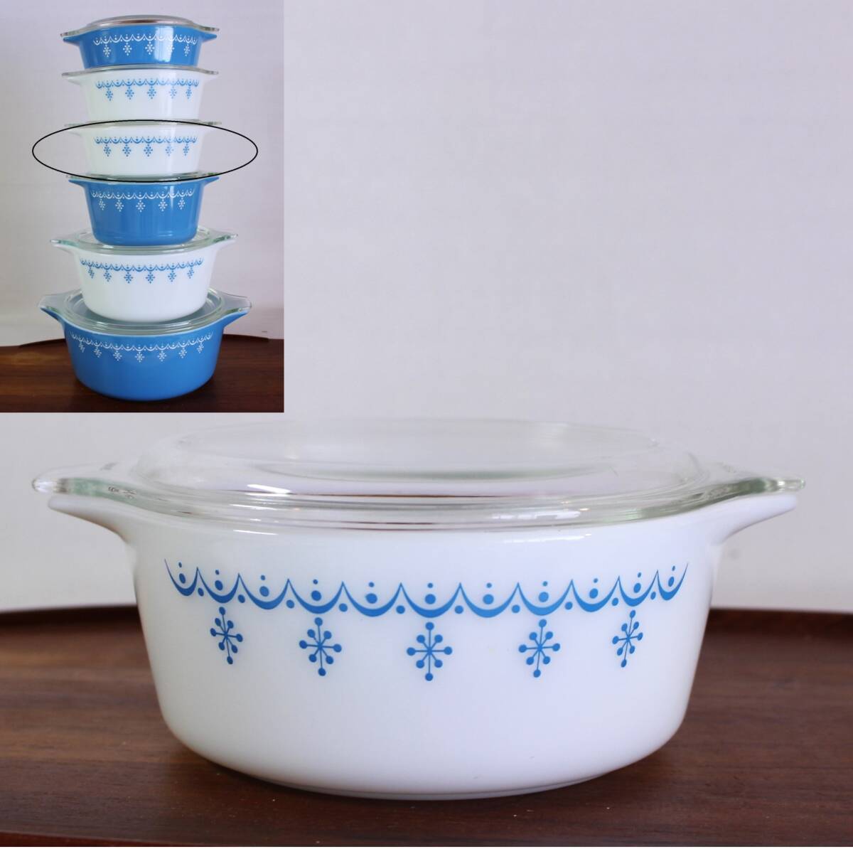 オールドパイレックスのホワイトにブルーの雪の結晶がプリントされたスノーフレークの、蓋付キャセロールです。