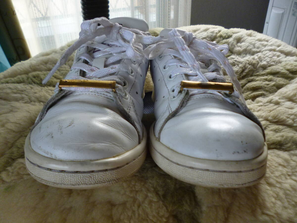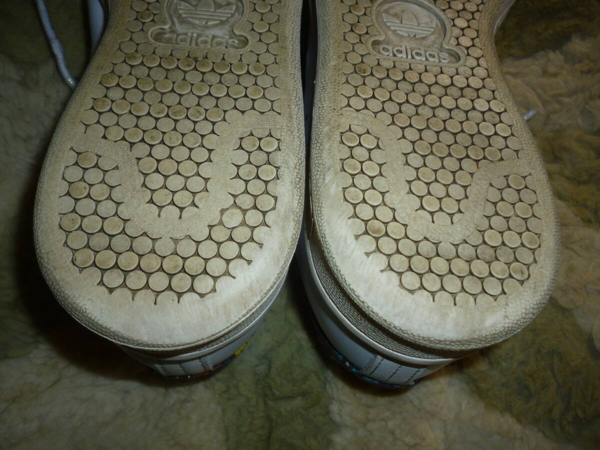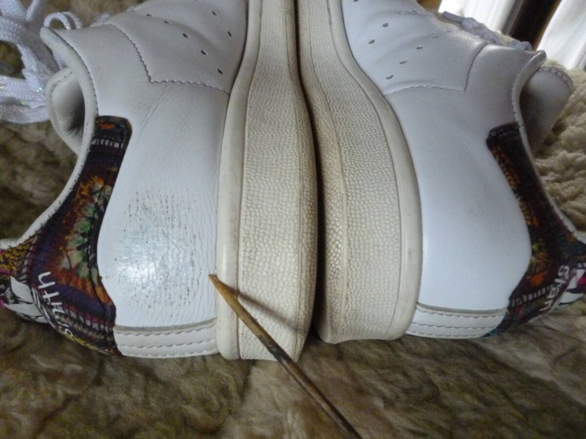 左右のつま先に小さい擦り傷、左の踵辺りに直径3㎝程の擦り傷箇所・左右の履き口当たりに約2㎝程の擦り傷箇所を目立たないよう、白く塗装しています。踵の減りは少なく、塗装箇所以外に目立つ汚れ・傷みない状態です。靴紐の金色メタルプレートに黒く変色箇所あり。(状態説明は外観のみの個人的な感想で、品質・機能・動作等を保証するものではありません)