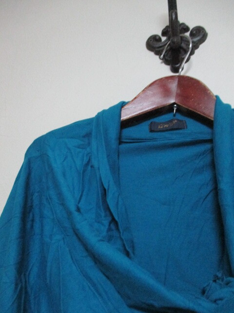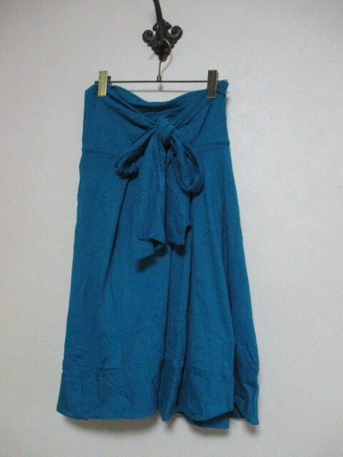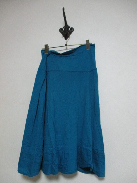 商品紹介 | 青緑系の色合いがキレイな膝下丈スカートです。 ウエストは左横に少し調節ができるボタンと 腰紐リボンが付いています。 中央辺りと左横(ボタンが付いている部分)に1か所ずつと 後ろ左側に2か所、タックが入っています。 ウエスト部分を調整してポンチョのようにも着られるアイテムです 《素材》 綿100% |