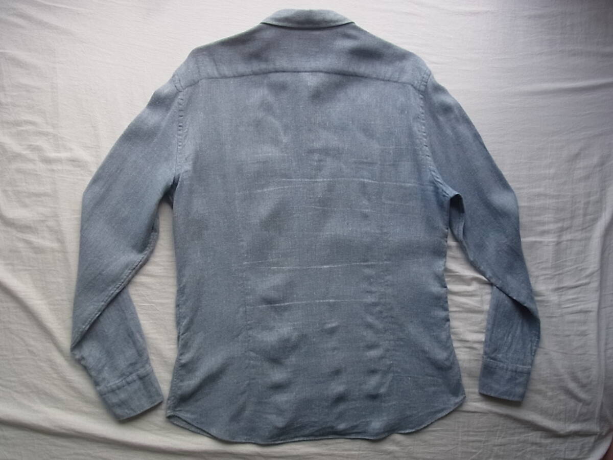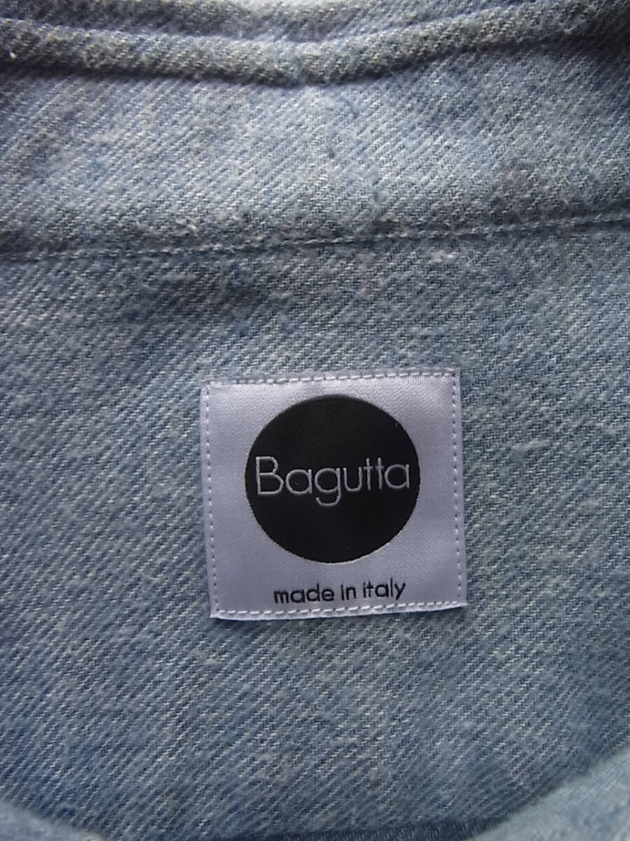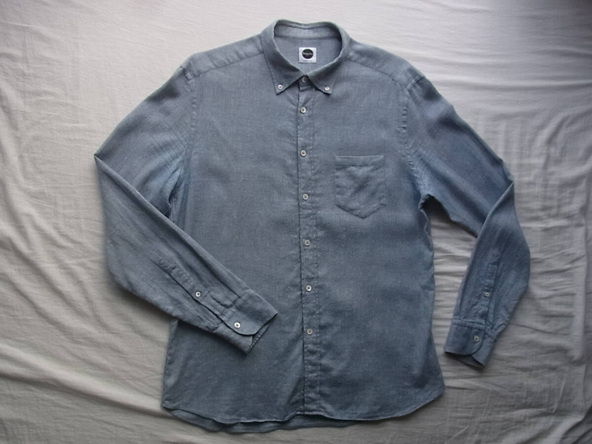 バグッタのリネン×コットン×ウール×カシミヤ4者混でビエラ素材のボタンダウンのシャツになります。USEDで着用感と、脇部分(7枚目の画像)にシワ、左袖ケンボロ部分(8枚目の画像)に薄く汚れた箇所が御座います。