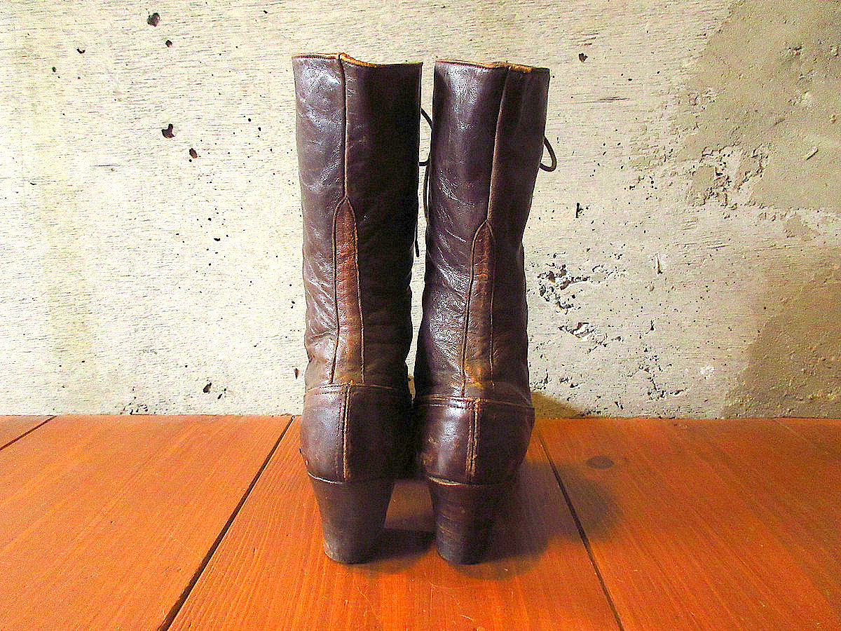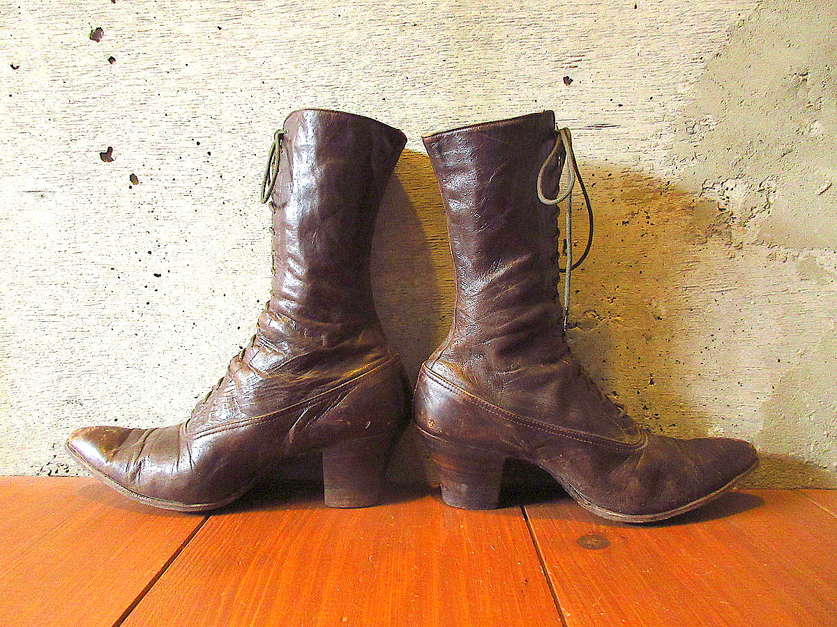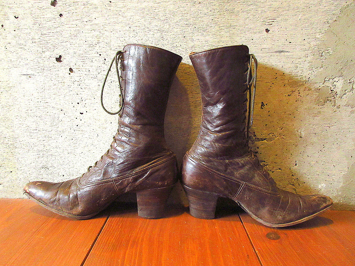 ビンテージ-20’s●レディースレースアップブーツ茶●240531k6-w-bt-225cm -1920sカンガルーレザーアンティーク