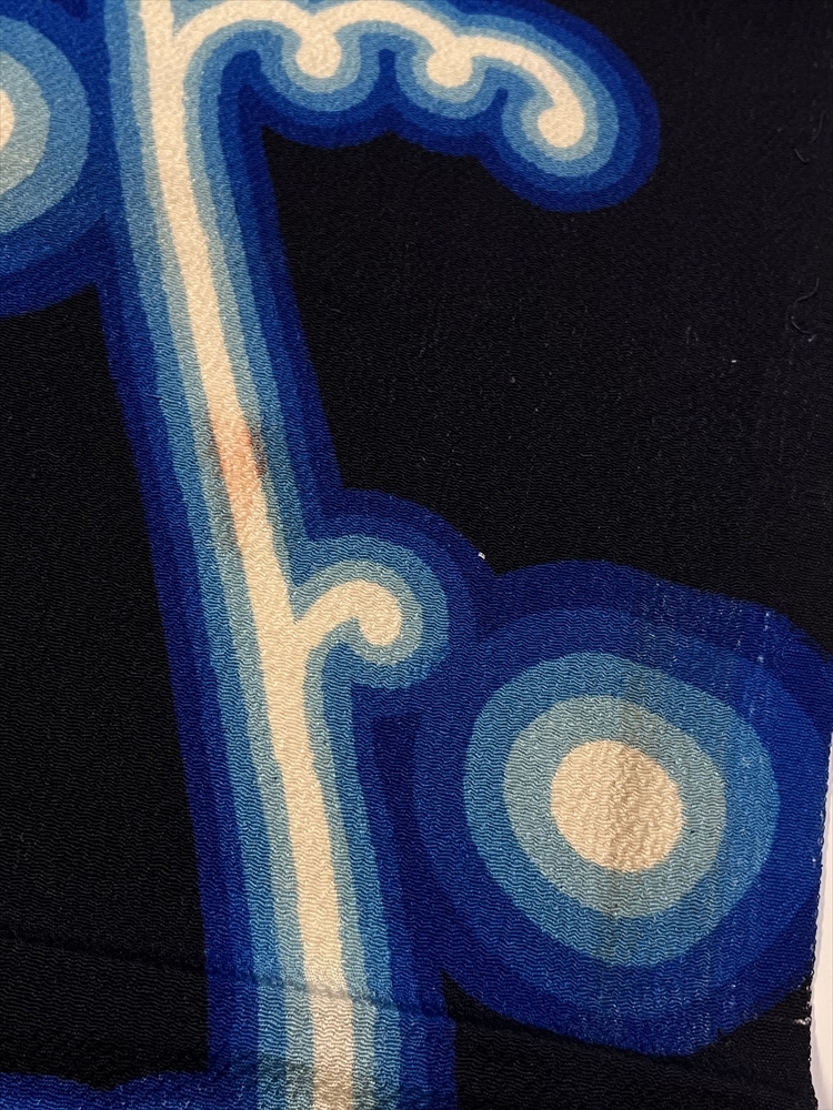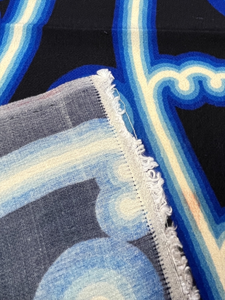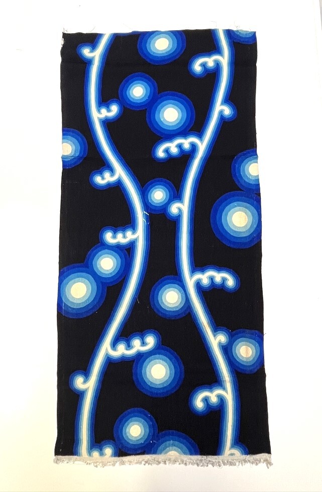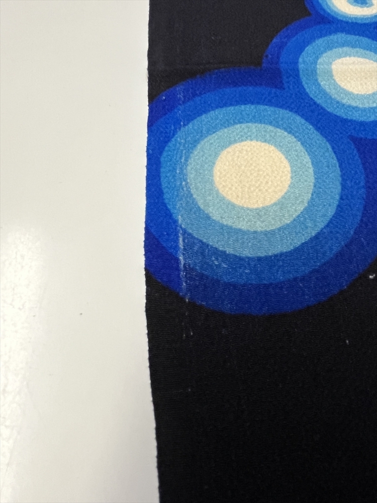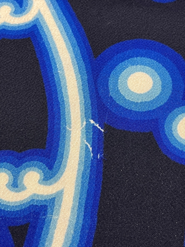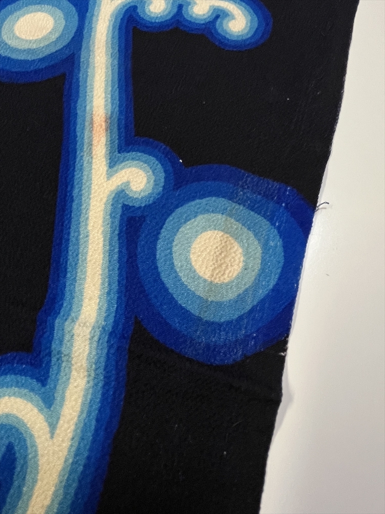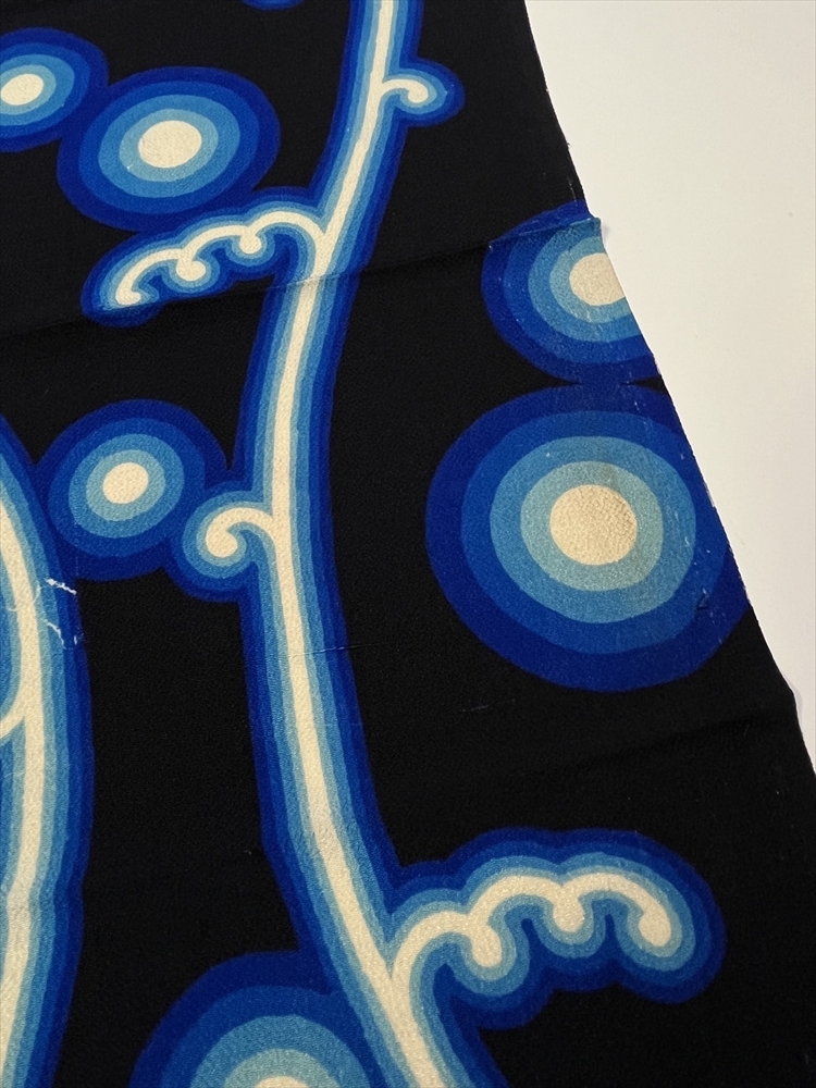 花とら●リサイクル端切れ 黒地 モダン 青丸 植物? 立涌風 リメイク 素材 細工用    240505-7