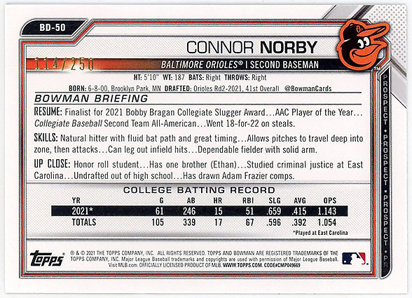 MARLINS二塁▲CONNOR NORBY/2021 1st BOWMAN DRAFT PROS #250 パープル版!