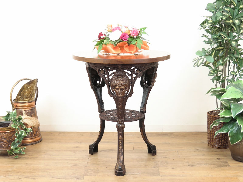 イギリスのパブやフランスのオープンテラスなどでよく見かける脚がアイアンのしっかりとした重量のあるテーブルです。新品ではありません。アイアンの脚の塗装が経年劣化により剥がれ、シャビーな風合いを醸し出しています。使い込まれた重厚なアイアンの脚が魅力的なテーブルですので、ガーデニングなどのテーブルとしても素敵にお使いいただけます。天板はオーク材の新しいものが取り付けられています。アイアンの脚の塗装の剥がれがありますので【 アウトレット品 ¥49,500 → ¥29,800 】として出品させていただきます。