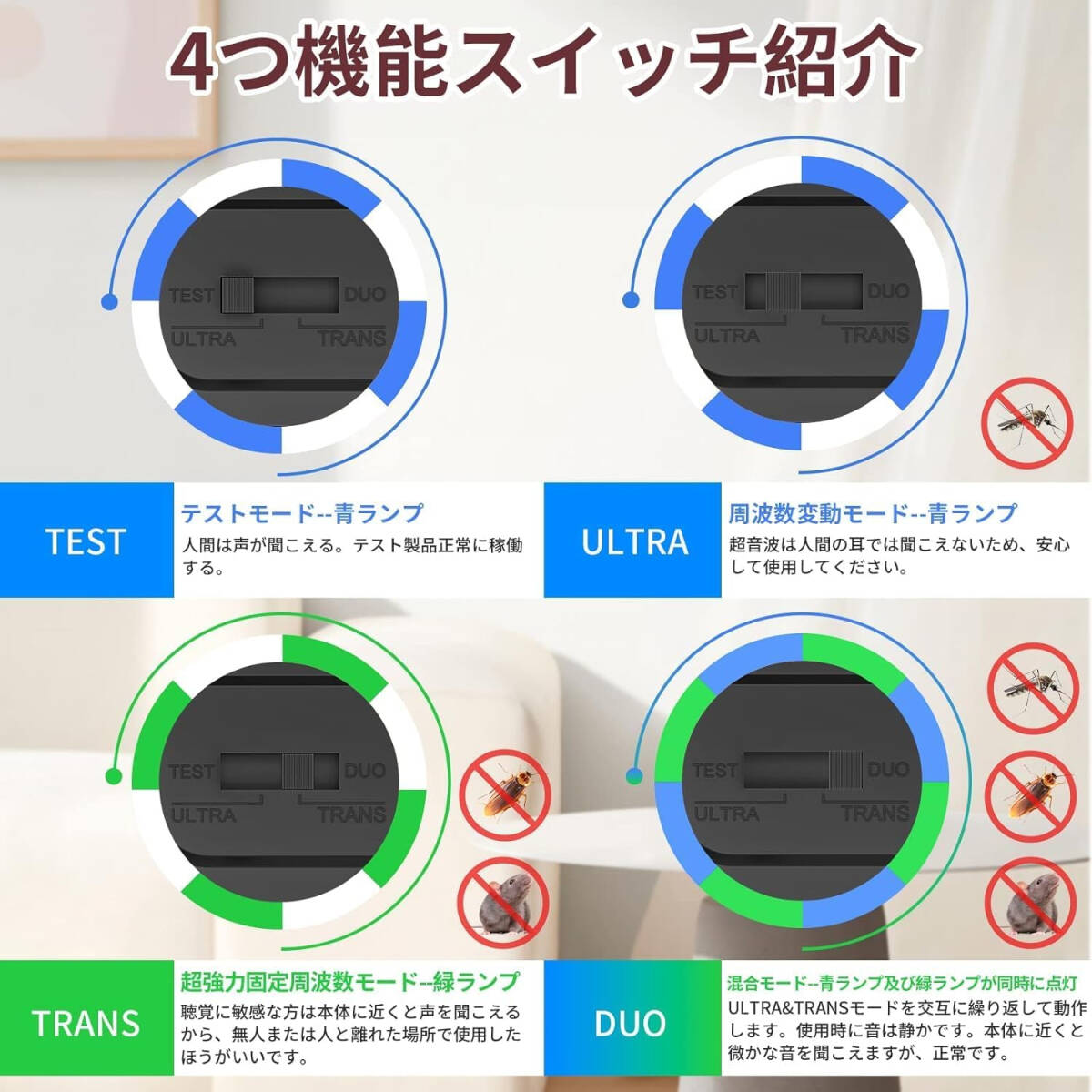 家に人がいるときに周波数変換モードを使用する:ULTRA(このモードには静音です) 誰も家にいない時はDUOまたはTRANSを使用する(些細な音があり、人体に無害、わずかなノイズのみ)。