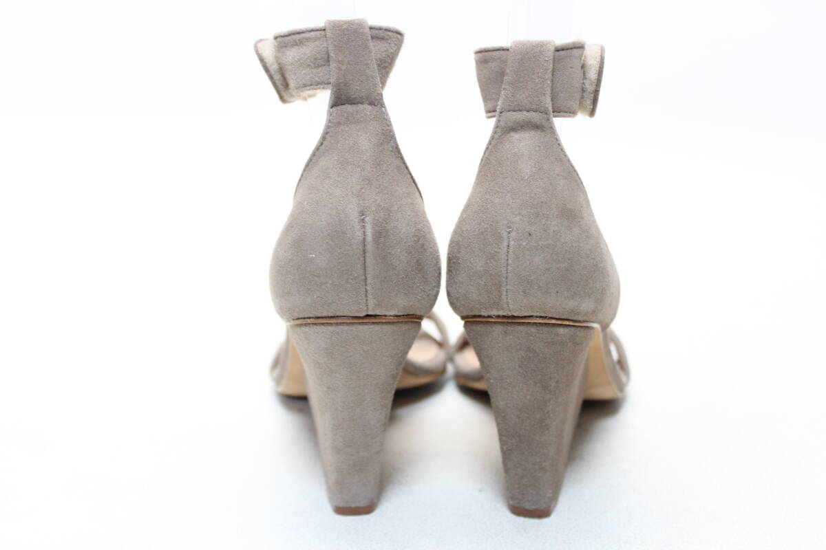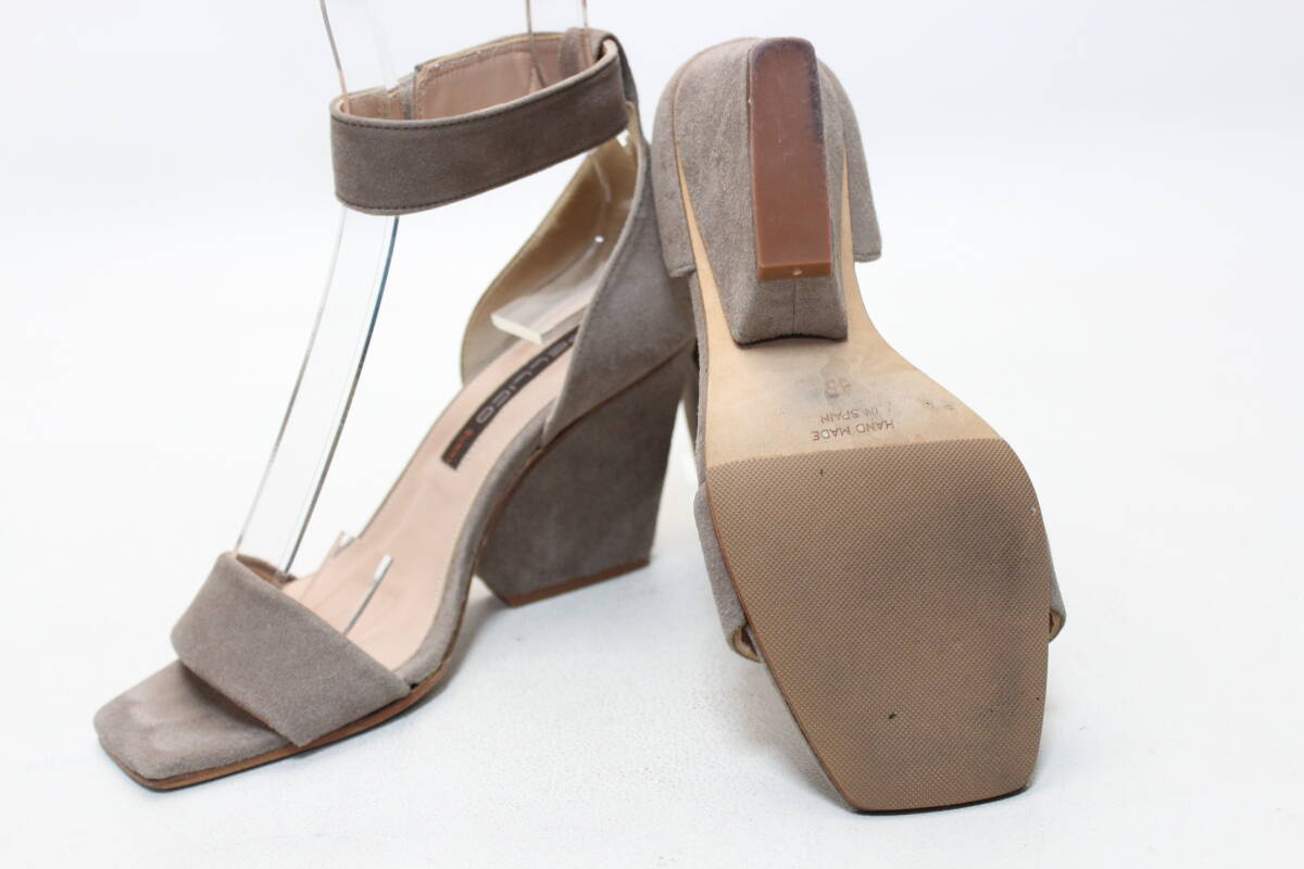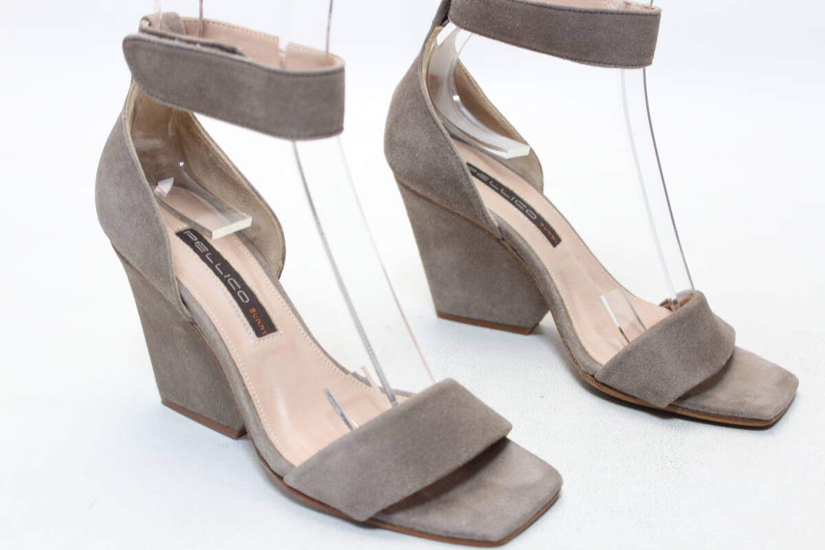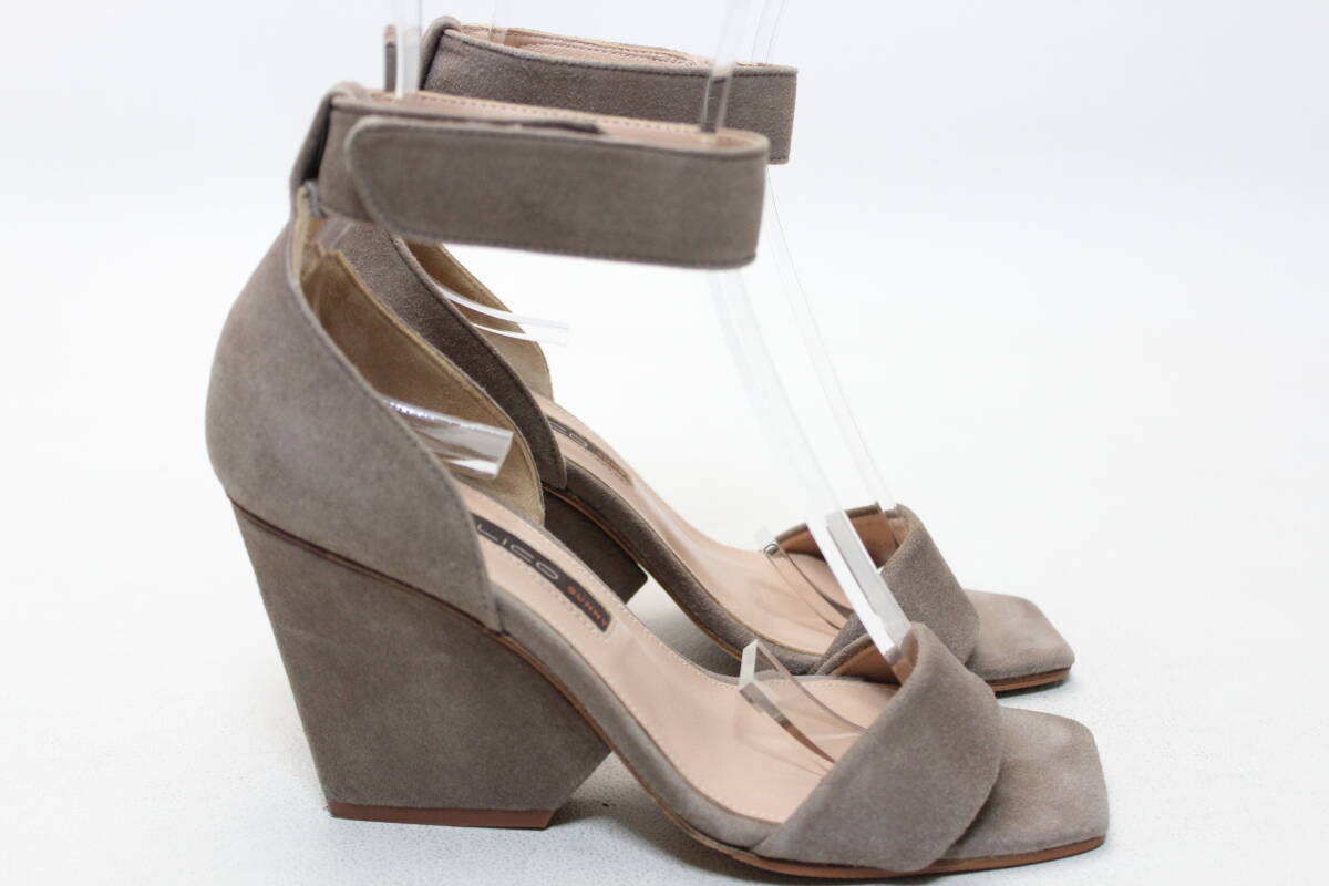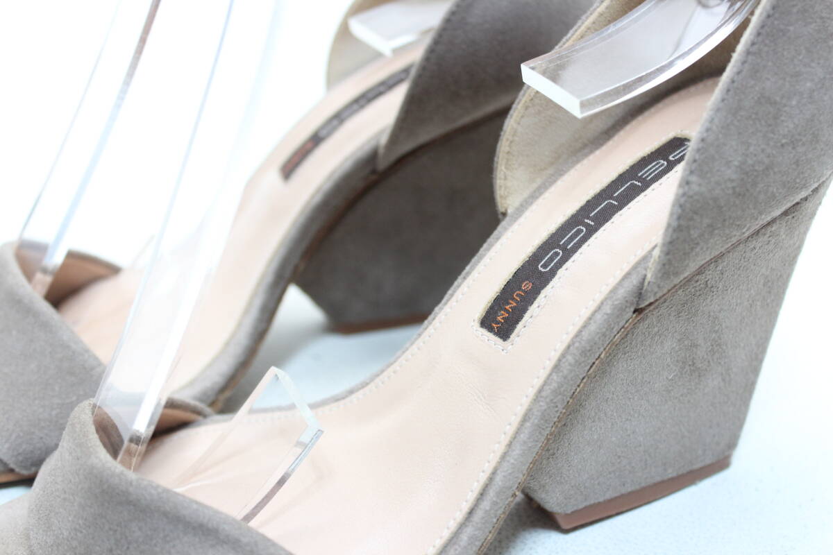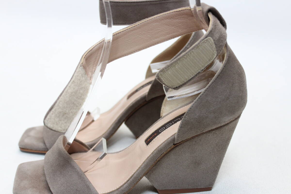 スクエアトゥのデザインが個性的な、ヌーディーカラーのスエードサンダル。
