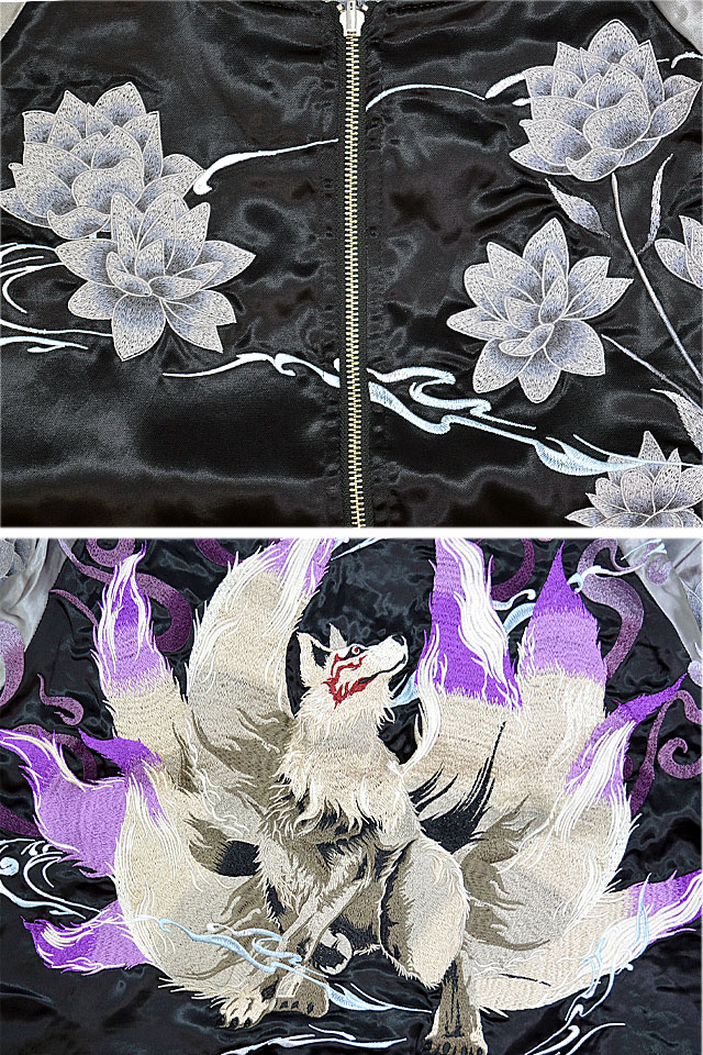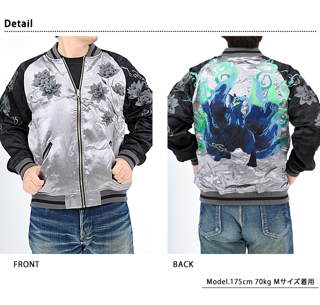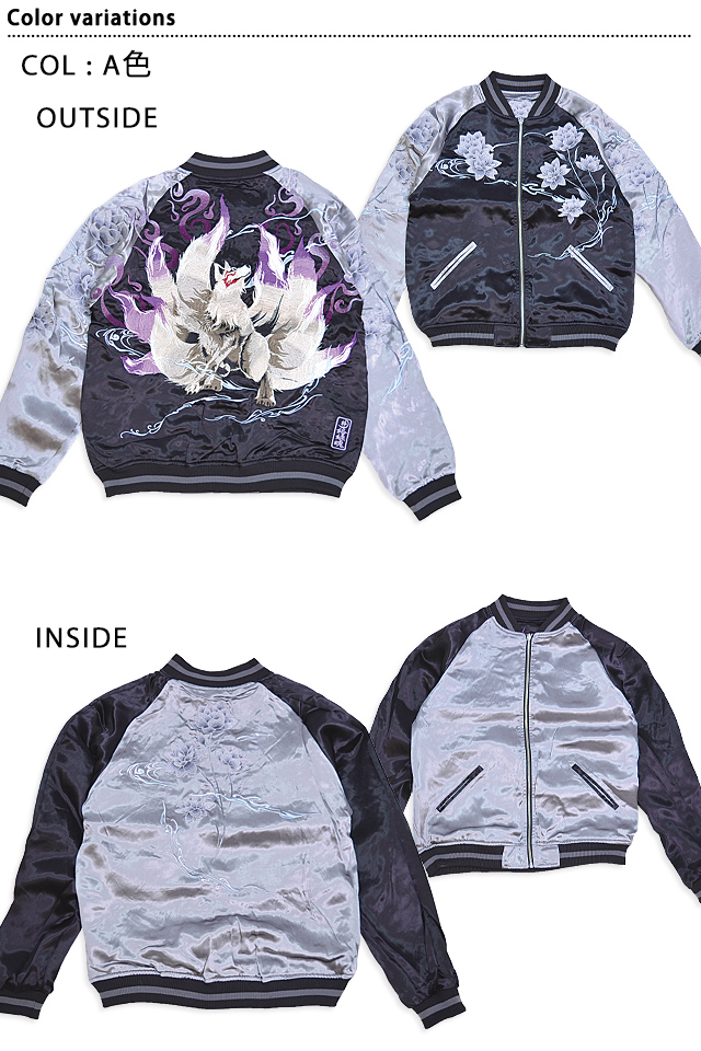 絡繰魂さんから「粋 九尾焔リバーシブルスカジャン(242070)」のご紹介です。 重みを感じる程の刺繍量が魅力的な粋シリーズから、最新作のスカジャンが登場しました。 今回モチーフの主役に採用されたのは、近年人気を博している九尾。 表面はしっかり柄の入ったスカジャンですが、対象的に裏面はシンプルに仕上げ、メリハリを付けました。 ボディーにはレーヨンサテンを使用し、ドレープや陰影がくっきりと現れています。 | ||||||||||||||||||||