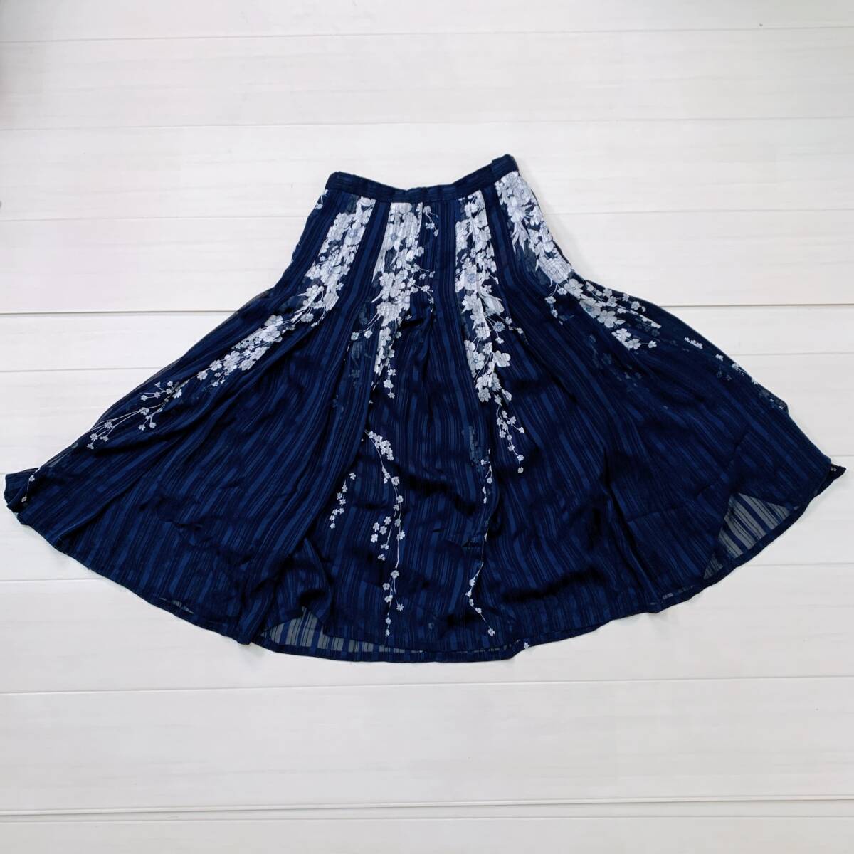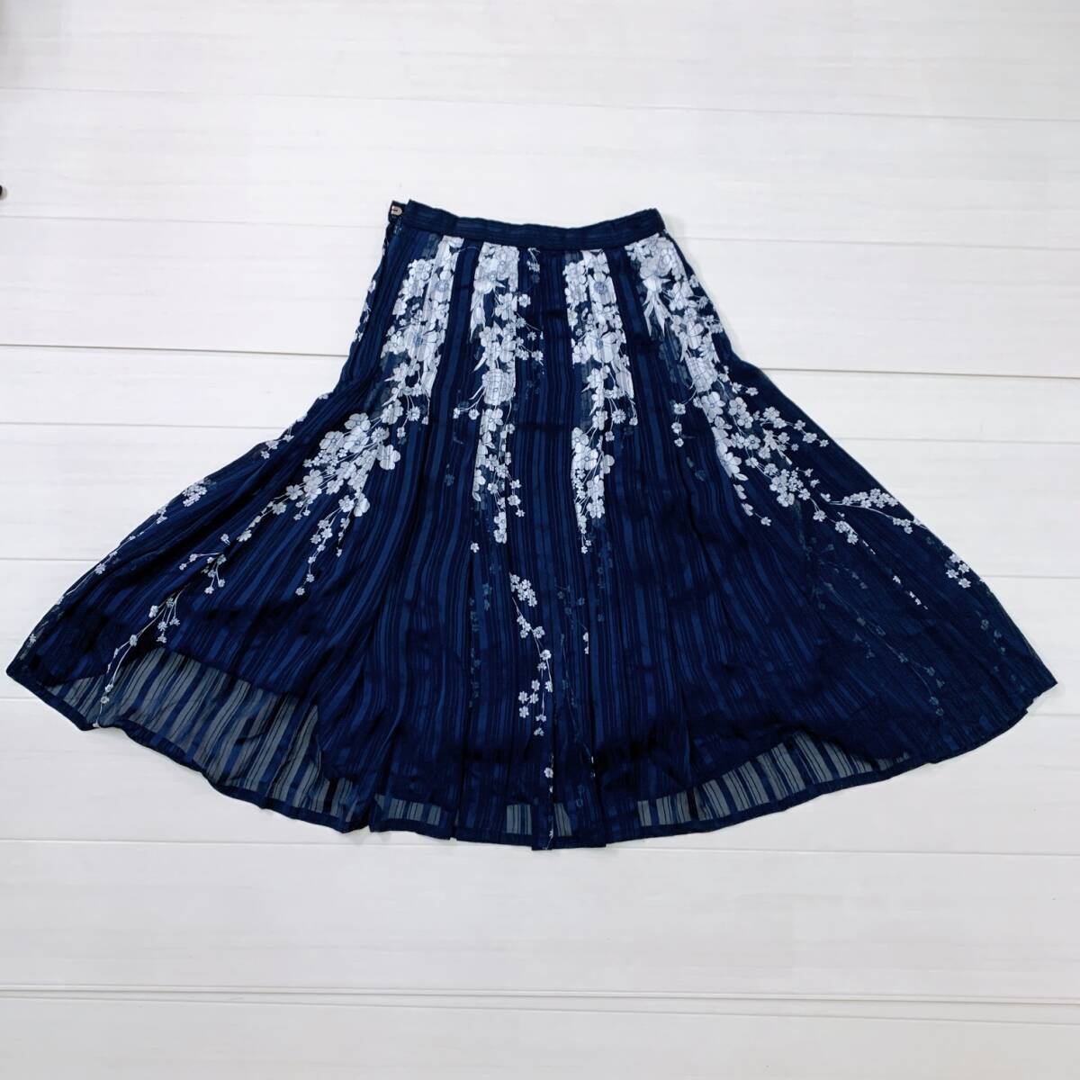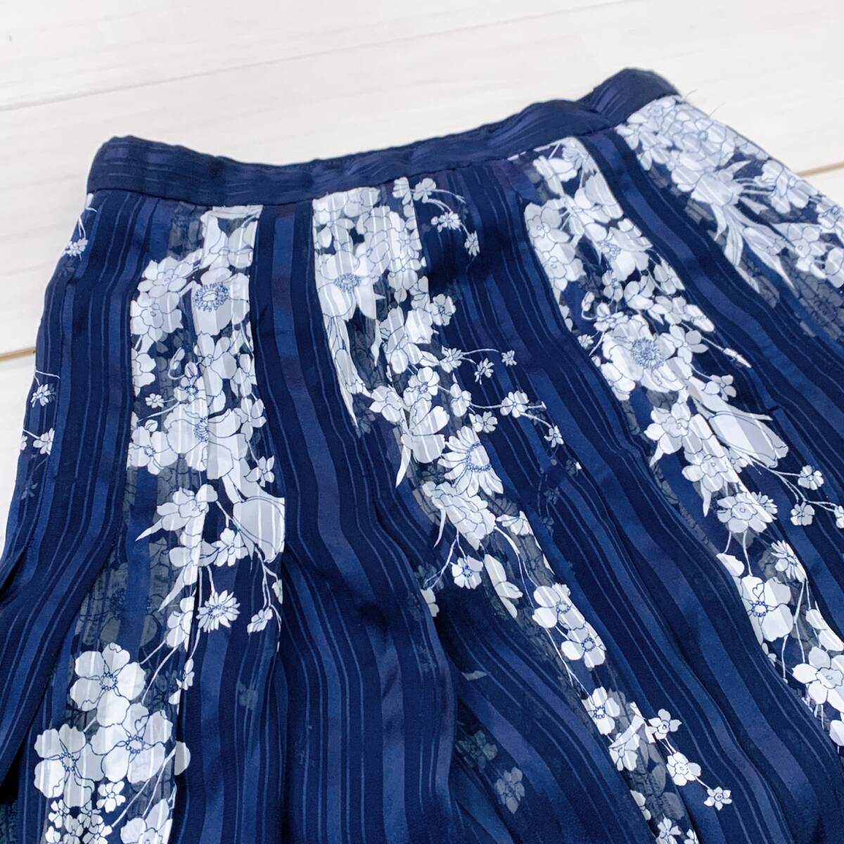 YH0537 レディース 総花柄 ひざ下丈 フレアスカート 薄手 裏地あり 華やか エレガント レトロ ネイビー 紺 万能 USED 古着