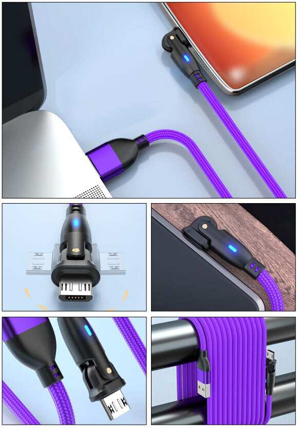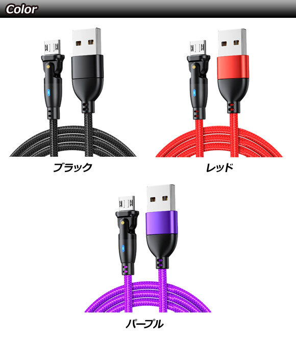 USB-A/マイクロUSB 変換ケーブル パープル 2m コネクタ回転式 オス-オス LEDライト付き AP-UJ1025-PU-2M