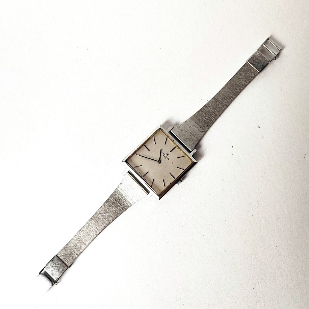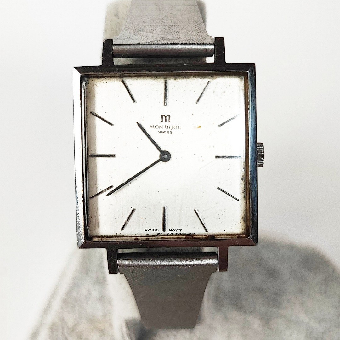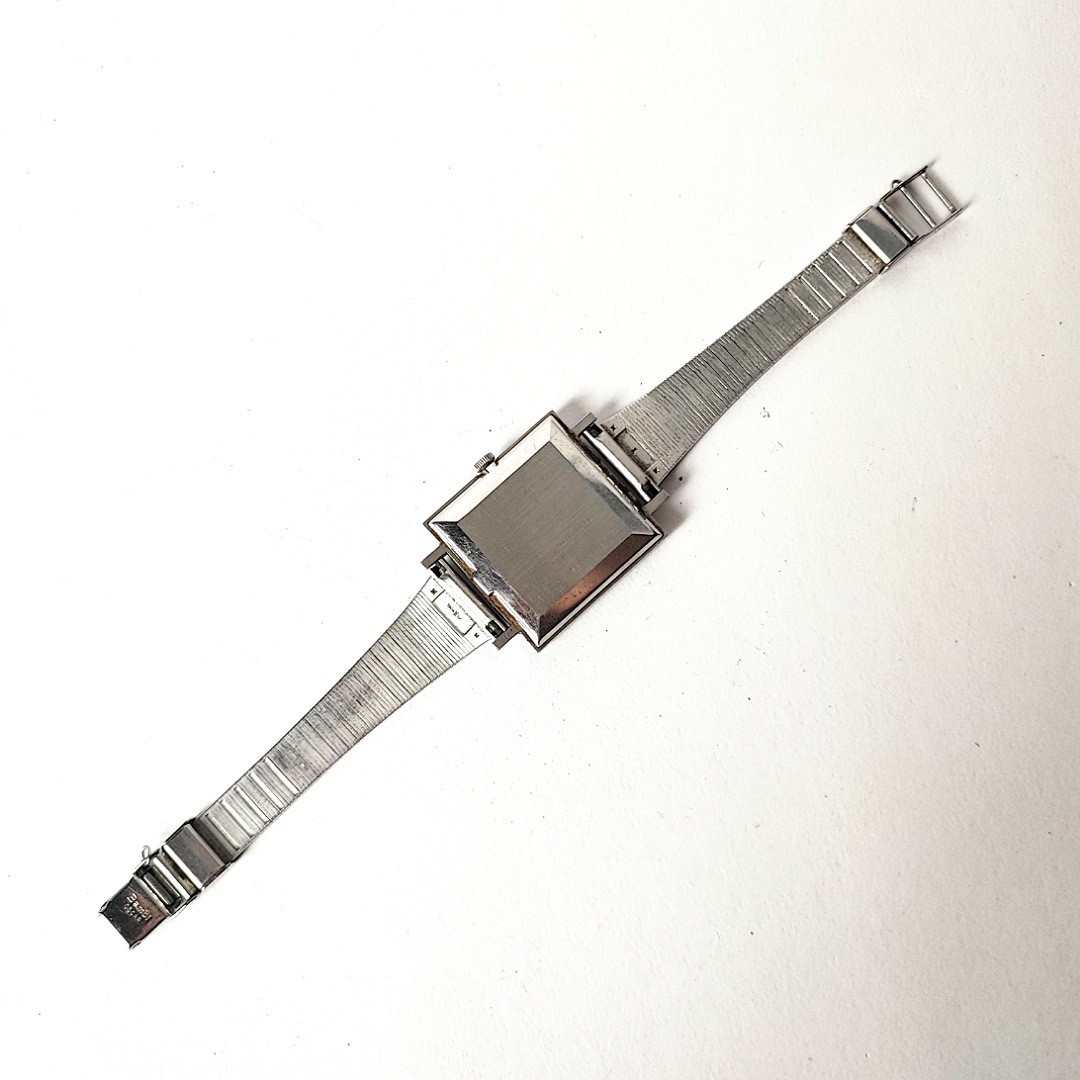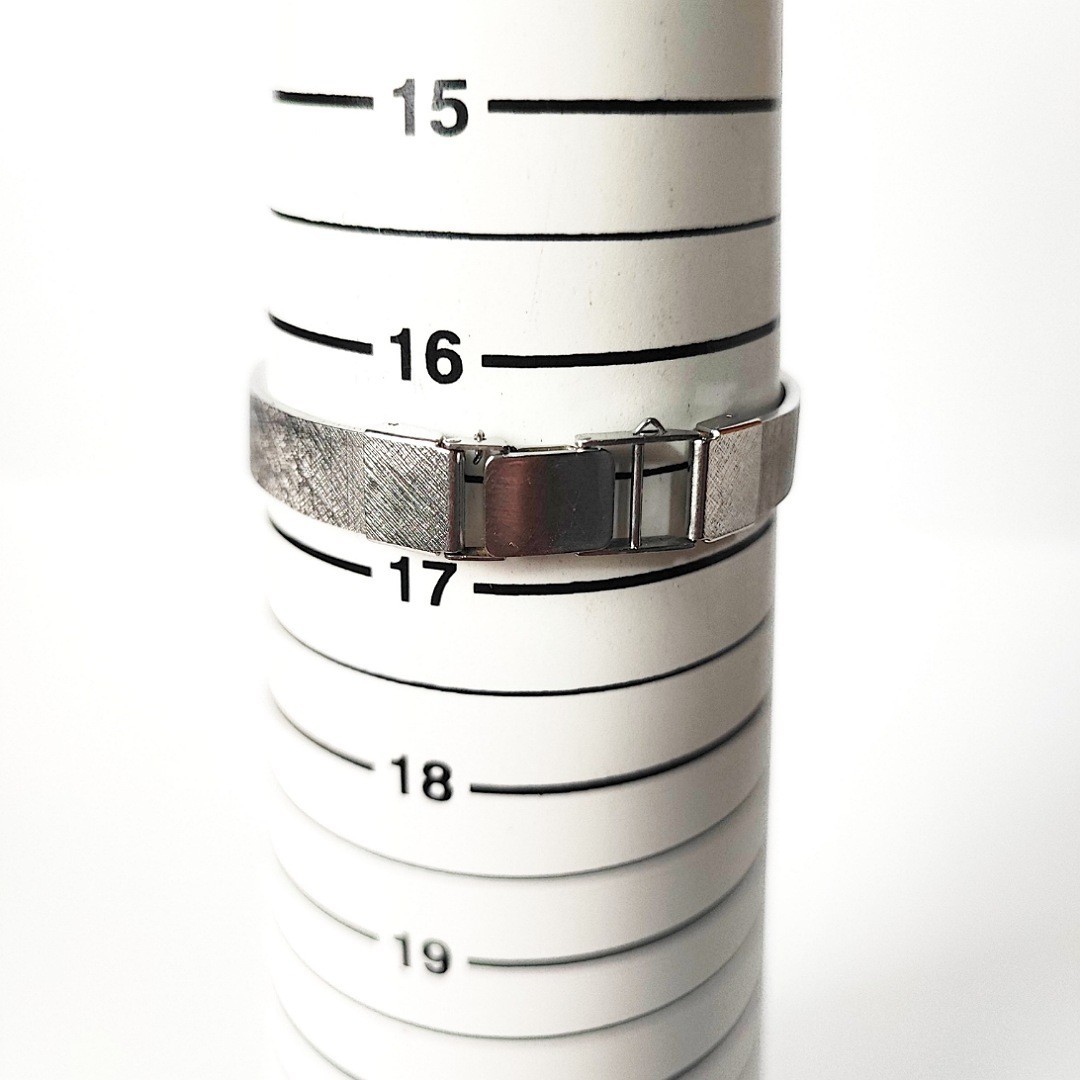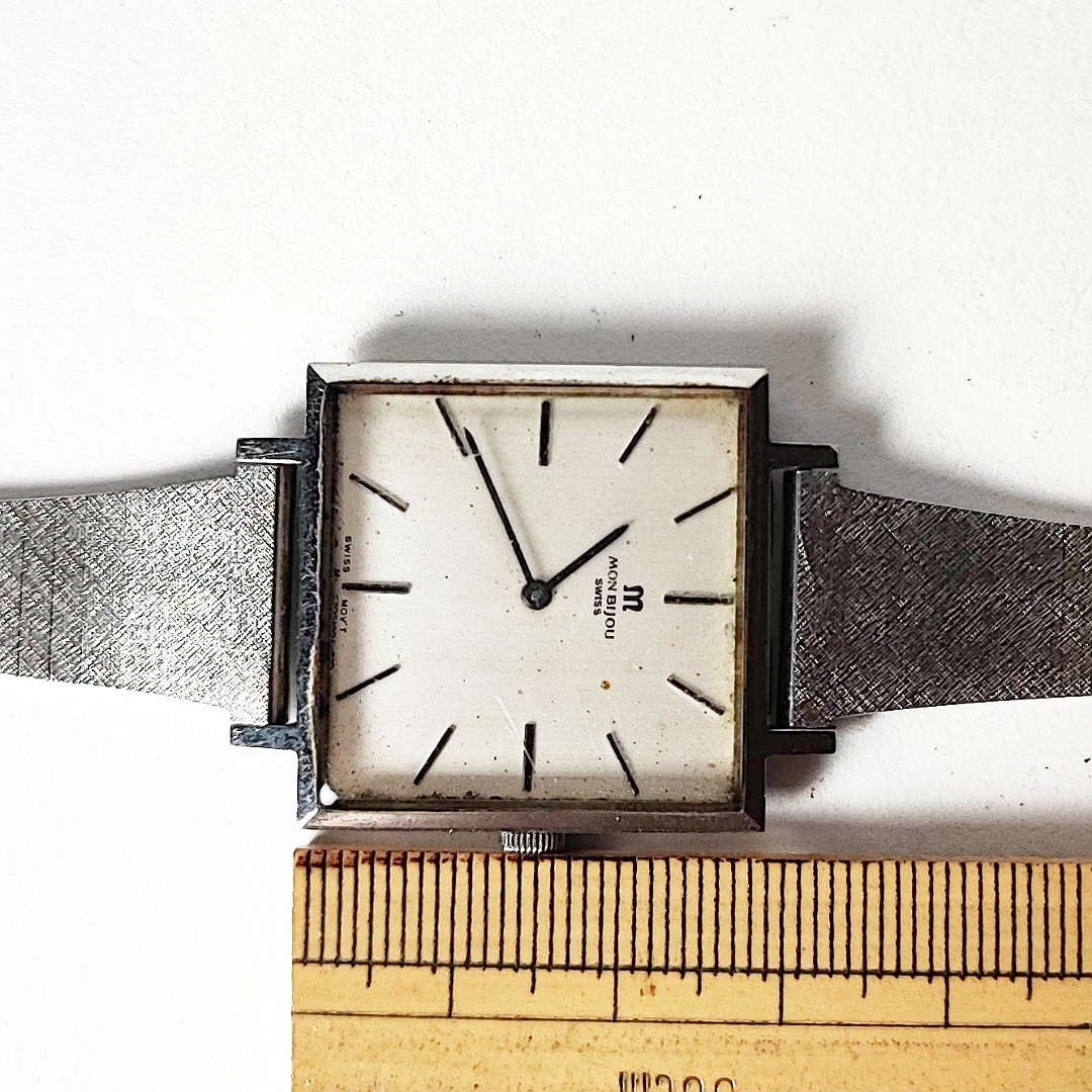 手巻き腕時計です。ケースサイズ横りゅうずを含め約29ミリ。巻いて針稼働しております。メンズサイズとレディースサイズの間くらいのサイズ感です。バンドは社外品で、元々ついていたチェーンがありません。取り付け幅が16ミリなので交換を前提にお願いいたします。