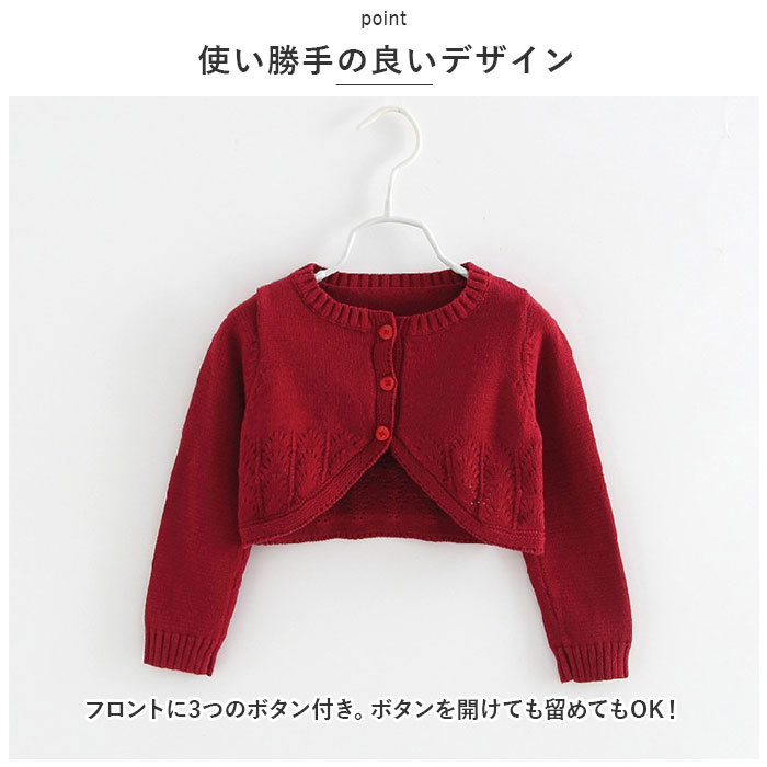 | 商品説明 | ・・女の子らしい繊細なデザインが魅力♪キッズ用のニットカーディガンが新登場。 ・【使い勝手の良いデザイン】 ・フロントに3つのボタン付き。ボタンを開けても留めてもOK!(※予備ボタン1つ付属) ・【いつものコーデにプラス】 ・お手持ちのトップスやワンピースの上に羽織るだけ♪ ・【チクチク感がなく快適】 ・柔らかく優しい肌触りのコットン素材を使用。 ・【1枚持っていると便利】 ・程よい厚みのある生地感で、肌寒い日も安心。  |