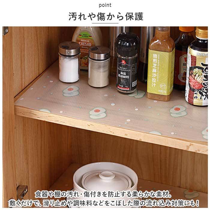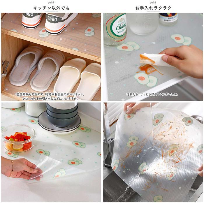 商品説明 | ・・様々な場所で活躍する保護シートが登場。 ・【可愛らしいデザイン】 ・空間が明るくなる!食べ物や植物などのプリント柄をラインナップ♪ ・【汚れや傷から保護】 ・食器や棚の汚れ・傷付きを防止する柔らかな素材。敷くだけで、滑り止めや調味料などをこぼした際の流れ込み対策にも! ・【お好みの大きさにカット】 ・約45cm×200cmサイズ。セットする場所に合わせて、ハサミでカットできるのが嬉しい! ・【お手入れラクラク】 ・汚れたら、サッと水拭きするだけでOK。 ・【キッチン以外でも】 ・防湿効果もあるので、靴箱やお部屋のキャビネット、クローゼットの引き出しなどにもおすすめ。 |