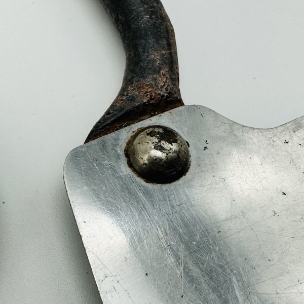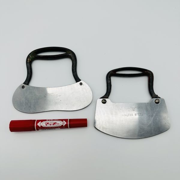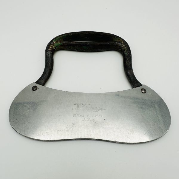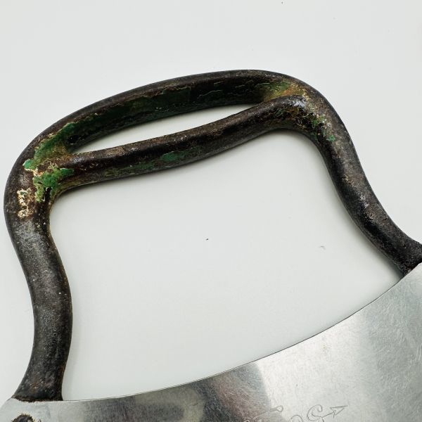 年代 :1940's前後辺り サイズ :横幅15.5cm x 縦13cm / 横幅14cm x 縦14cm 素材 :ステンレス / 鋳鉄 重さ :合計約 370g 製造国 :アメリカ アメリカで買い付けたビンテージ、生地カッター2個になります。 古い物ですがシッカリとした作りで力も入れやすいツールになります。 チーズやパン生地など扱う店舗のディスプレイなどにも良いかと思います。 ハンドル部分のサビが目立ちますが良いアンティーク感がでております。 切れ味は確認しておりませんが研ぐなどして問題なく使用可能です。 古い物のため細かいキズや使用感はありますので アンティーク品として理解頂ける方のみ入札下さい。 サイズは出来る限り正確に測っておりますが、多少の誤差はご了承ください。 写真をしっかりとご確認の上、入札して下さい。 (神経質な方はご遠慮下さい) 質問などありましたらお気軽に問い合わせ下さい。 細かい写真など詳細をご希望の方は拡大写真を送りますので、質問にメールアドレスをお載せ下さい。(ご質問内容は公開される事はございません。ご安心下さい) | |||
