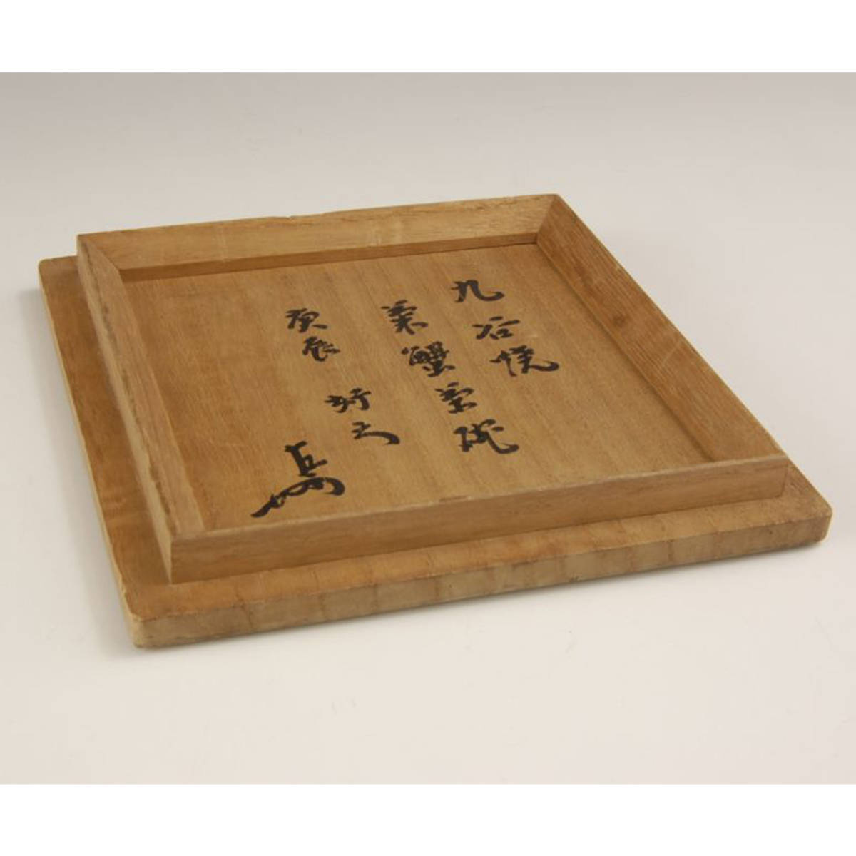 状態:箱蓋のみ。縁に凹みと表にソゲ1ヶ所あり。「九谷焼 菊蟹茶碗 庚辰好之」箱内寸は幅13.6cm角になります。(箱下を作った場合)