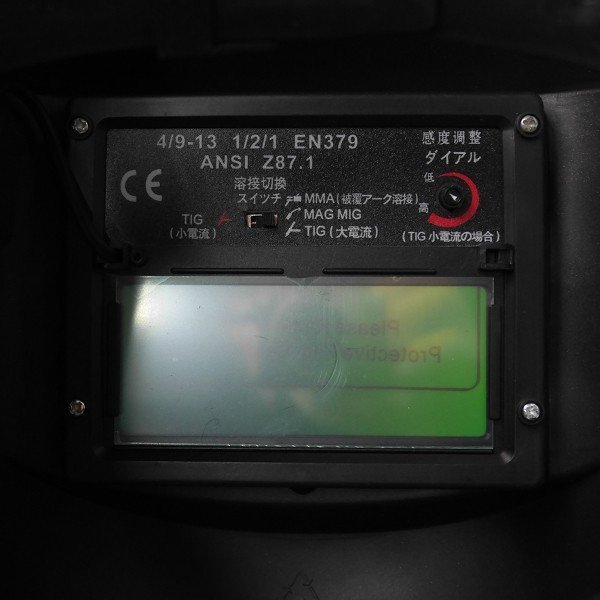 20A以下の溶接電流にも反応する感度調整機能で、TIG、半自動溶接低電流アークにも対応できます。 #9〜#13までの遮光度(暗さ)調整機能で無段階調整が可能です。