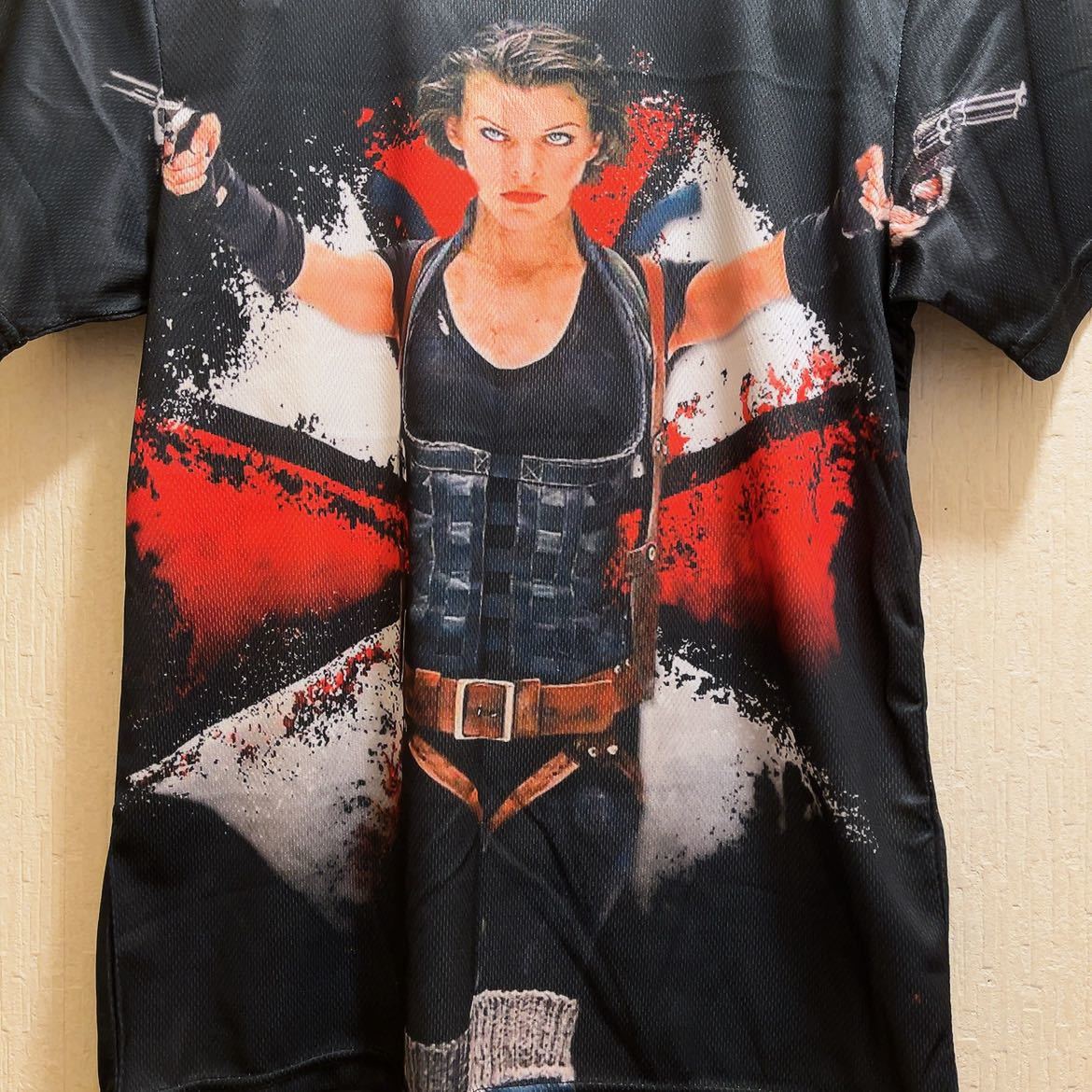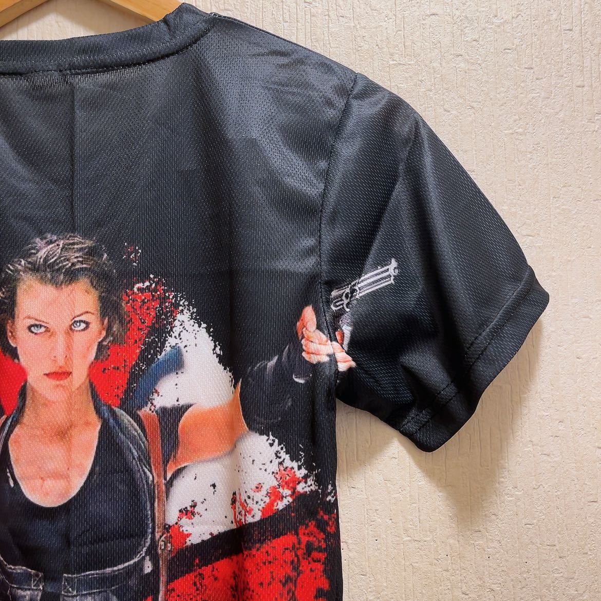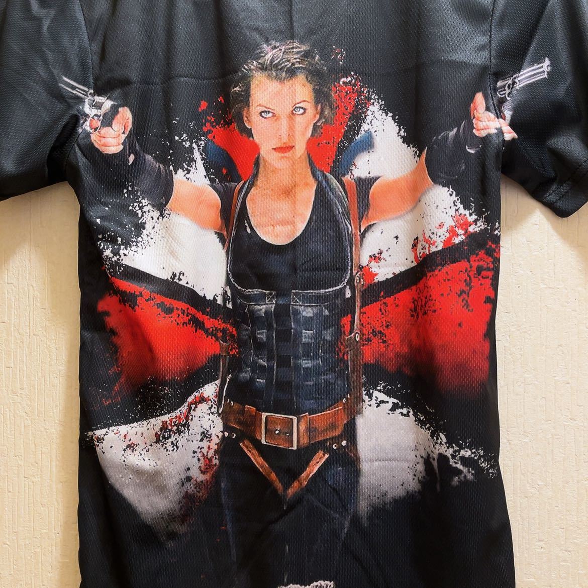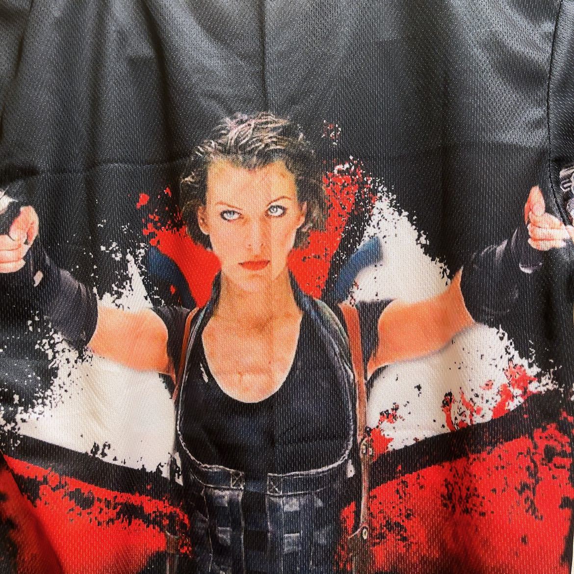 ★2002年に公開され6作、大ヒットしたバイオハザードのミラジョヴォヴィッチがガンを構えた姿がプリントされたTシャツです。バックプリントあり。