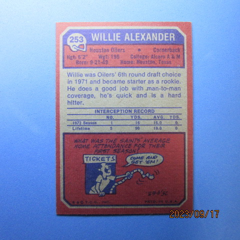1973 Topps Football #253 Willie Alexander (ROOKIE)