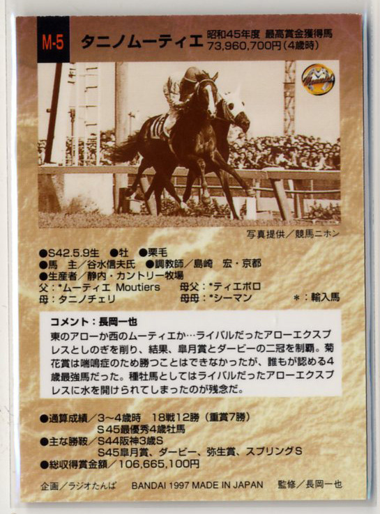 | ★タニノムーティエ M5 メモリアルカード バンダイ サラブレッドカード 97年上半期版 安田伊佐夫 日本ダービー馬 皐月賞馬 写真 画像 競馬カード 即決 | |