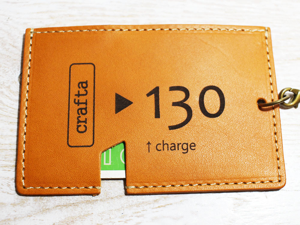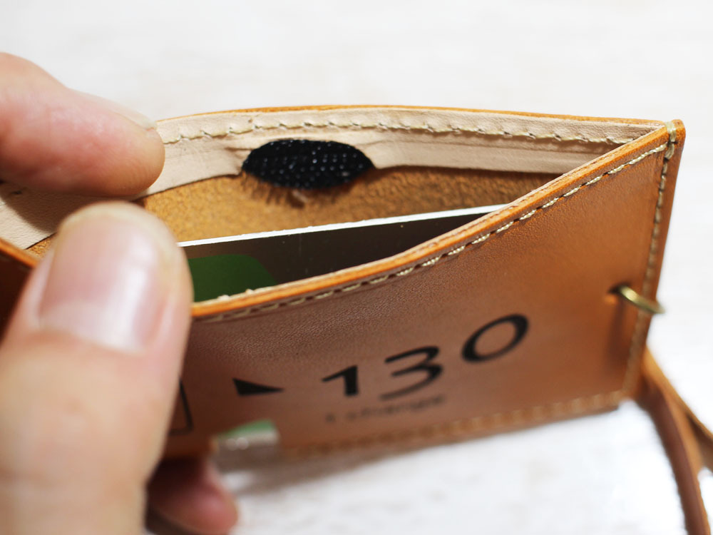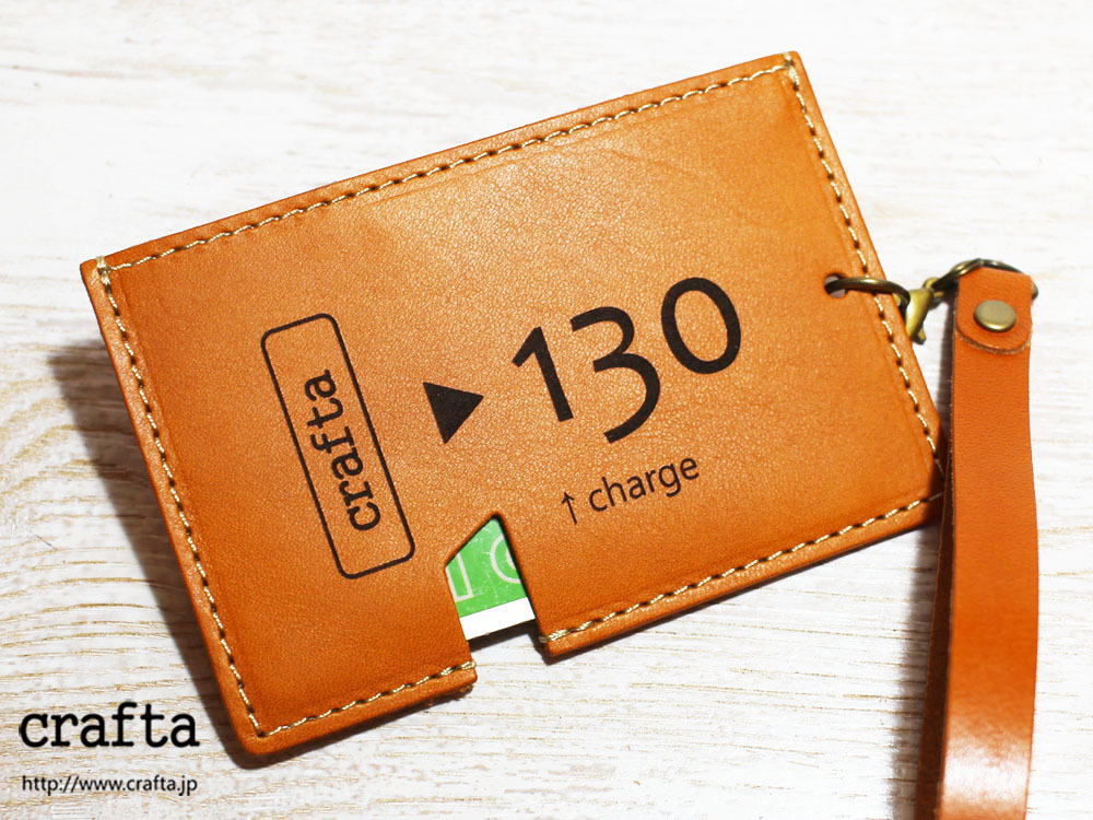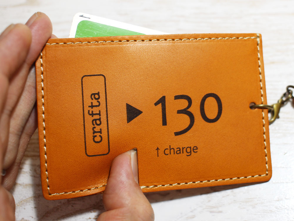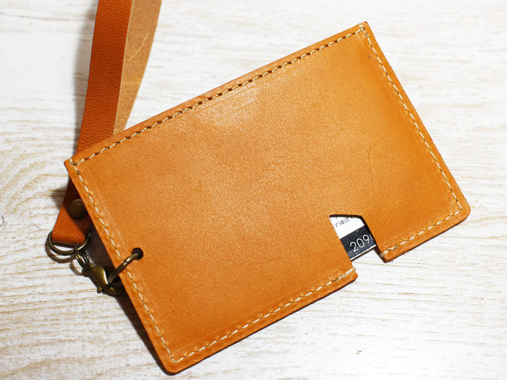 味わいのある牛ヌメ革を使い、「昔の切符」をモチーフにパスケースを作製しました。切符の図案はレーザー刻印で入れています。名前の「s-kip」は「スマート切符」の略です(笑)昔の切符で改札タッチ、というオツな一品です。チャージ等でカードを取り出す際は切符の「ハサミ」部分から指で押し上げることで、取り出しやすくなっています。内側にはカード脱落防止のため小さいマジックテープを縫い込んでいます。簡易的なストラップつきです。