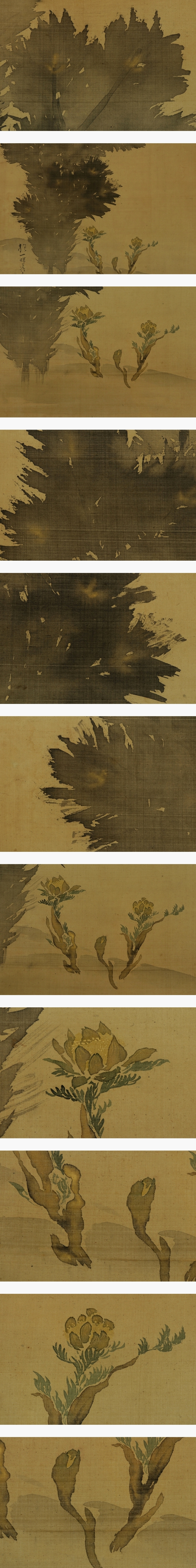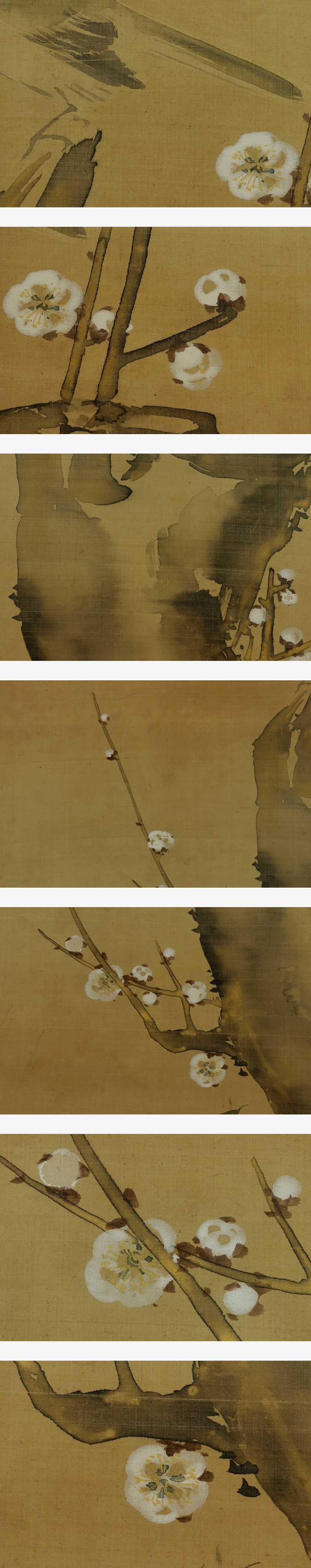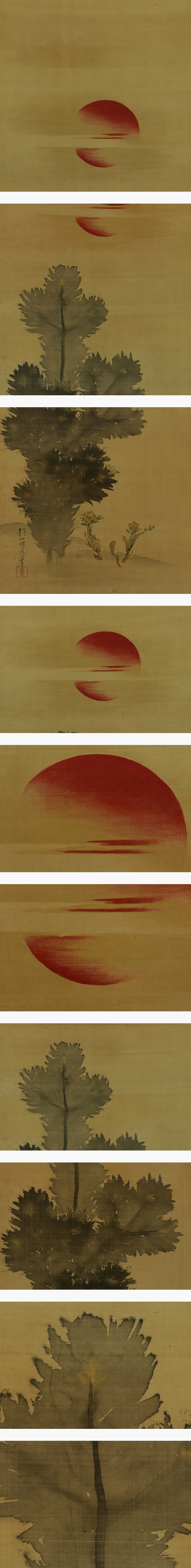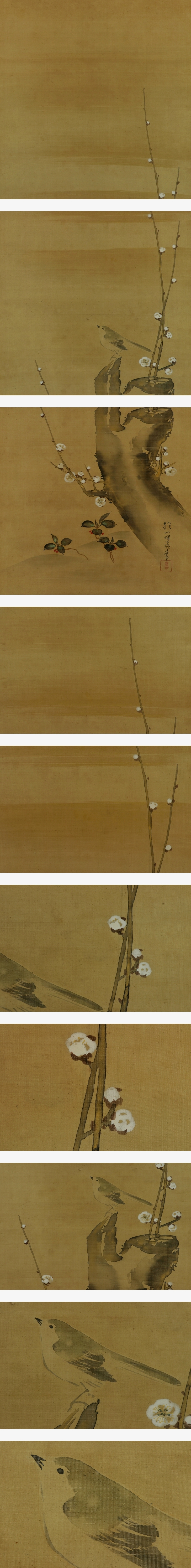 酒井抱一 さかい-ほういつ(1761-1829) 江戸時代中期-後期の画家,俳人。 宝暦11年7月1日生まれ。酒井忠仰の次男。播磨姫路藩主酒井忠以の弟。 37歳で出家し,文化6年江戸根岸に雨華庵を営む。 絵を狩野高信,宋紫石,歌川豊春に学び,のち尾形光琳に傾倒。 「夏秋草図屏風」など琳派風の絵を描いた。俳諧にも優れた。 文政11年11月29日死去。68歳。江戸出身。 名は忠因。字は暉真。通称は栄八。別号に鶯村など。 本紙は、染み、汚れ、軽い皺、ヤケ、剥落があります。 表装は、染み、汚れ、折れ、軽い皺、ヤケ、軸先に汚れとヒビ、軸紐に劣化があります。 【サイズ】 作品 横約40.5cm×縦約108cm 表装 横約51.5cm×縦約184cm |
