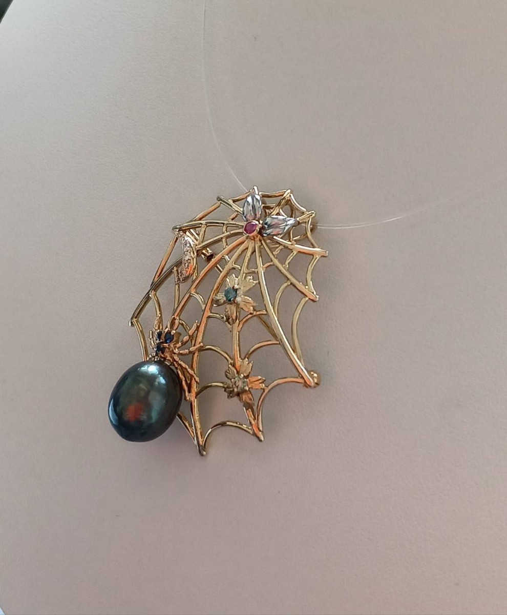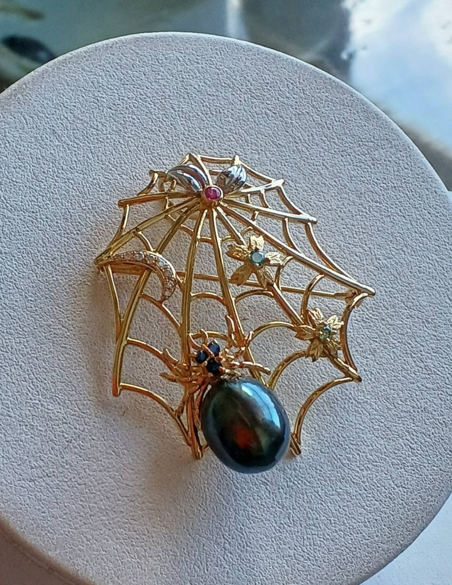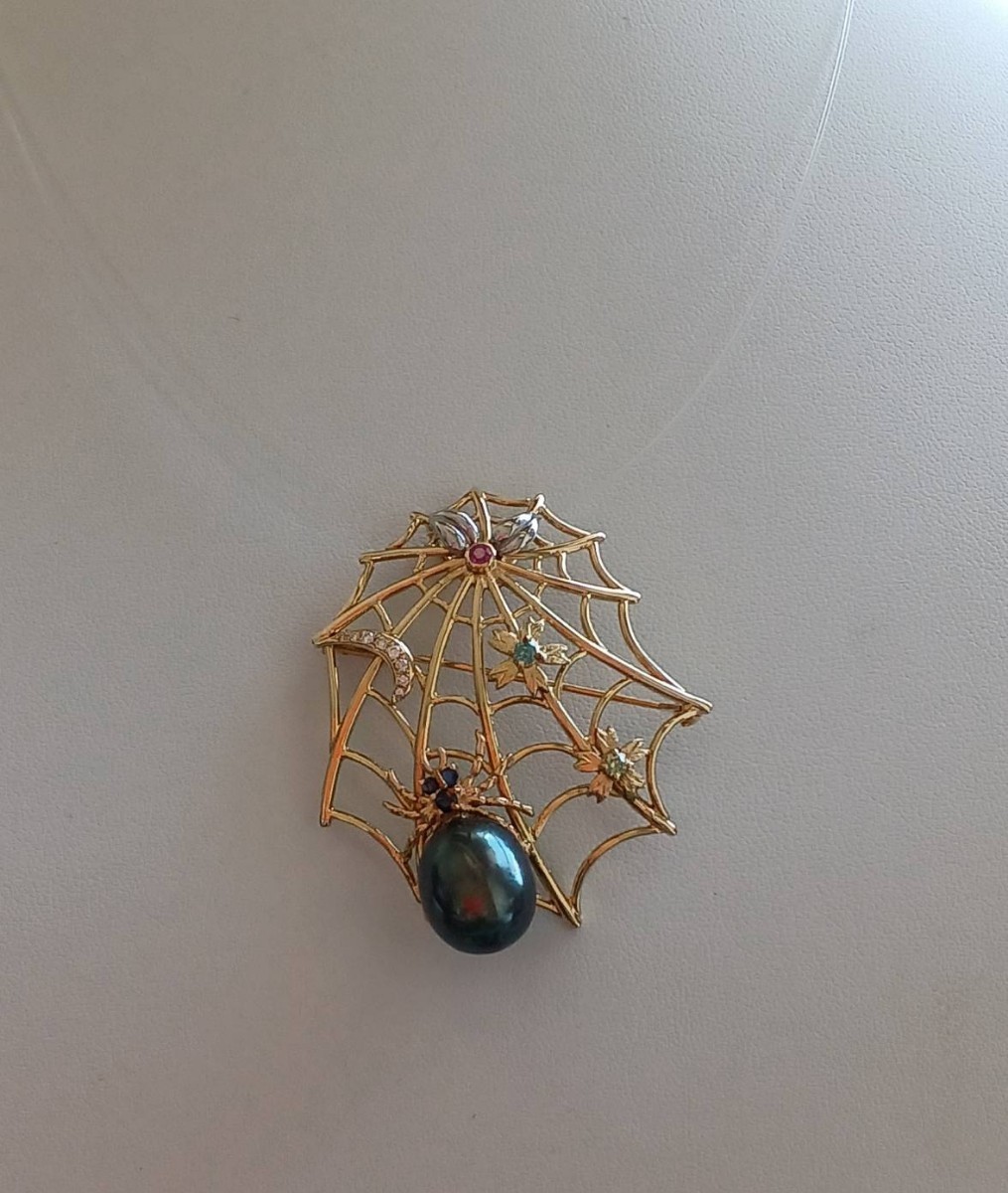 クモの巣デザイン黒蝶真珠ペンダント兼ブローチ