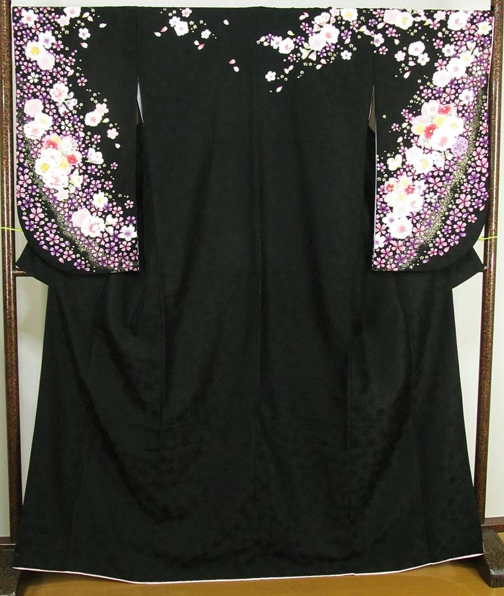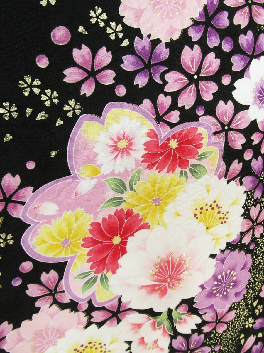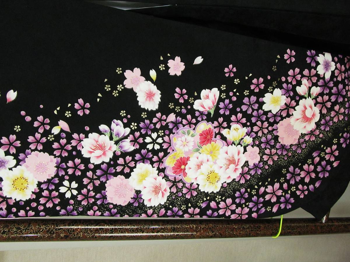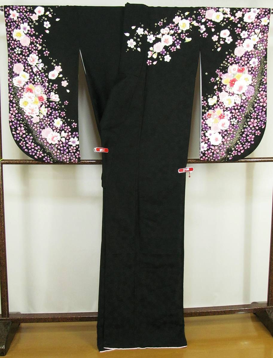 さ199 化繊 二尺袖 黒地に花々 身丈170cm ◎◎セール◎◎