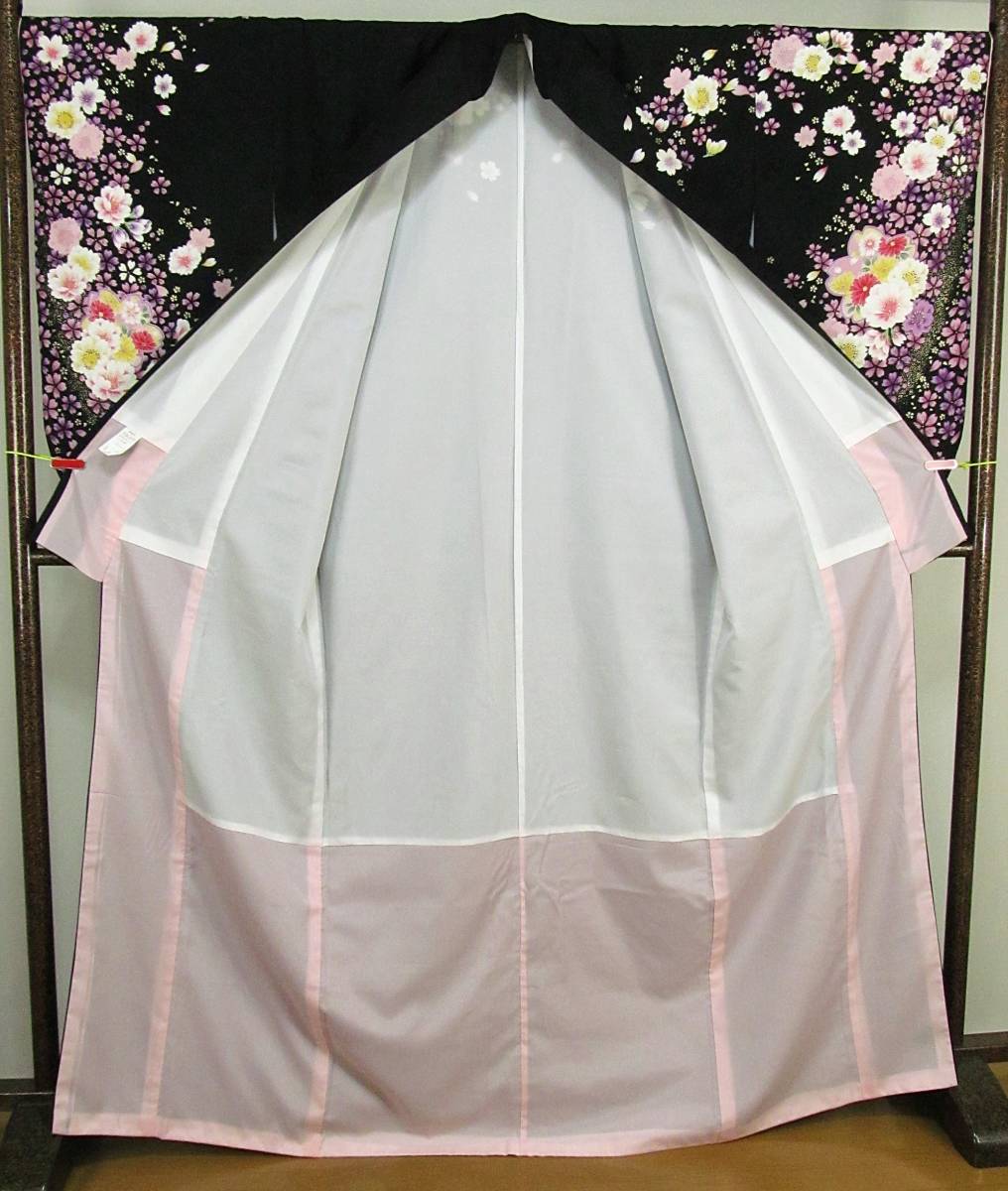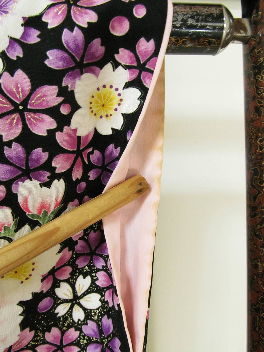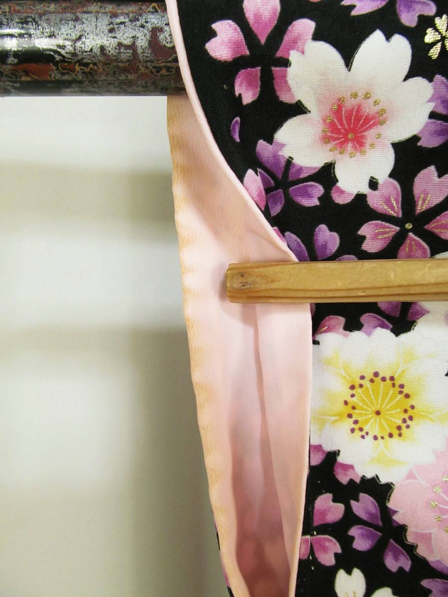 さ199 化繊 二尺袖 黒地に花々 身丈170cm ◎◎セール◎◎