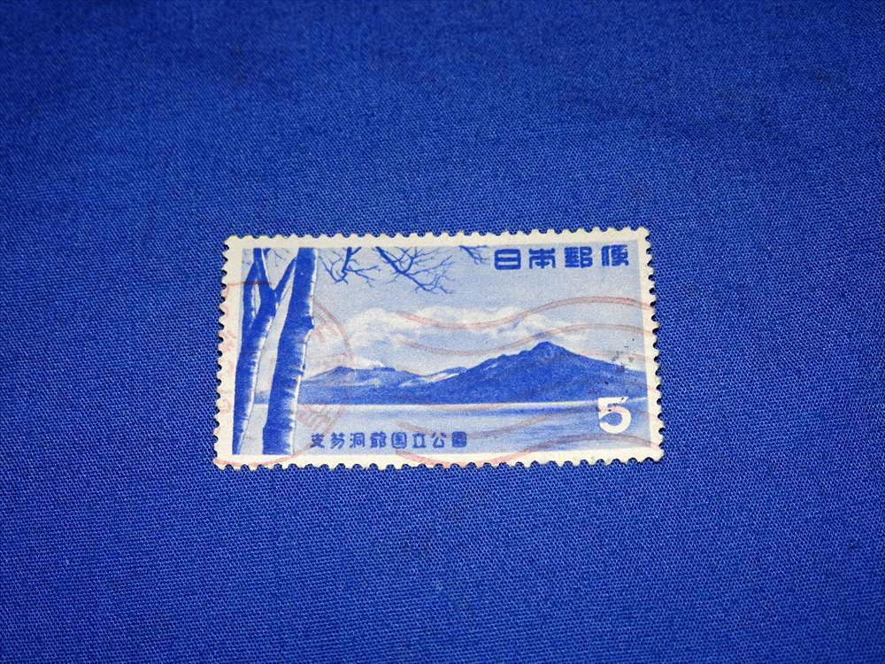 S28発行の支笏洞爺国立公園5円切手の使用済です。下関東局のとび色機械印が押印されています。日付は非常に読みにくくなっています。状態は画像でご確認ください。