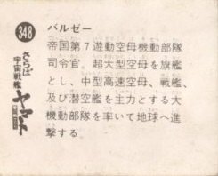 1978年公開の映画「さらば宇宙戦艦ヤマト愛の戦士たち」の、上映当時発売された(多分)アマダの10円2枚引きカード「348 バルゼー」です。