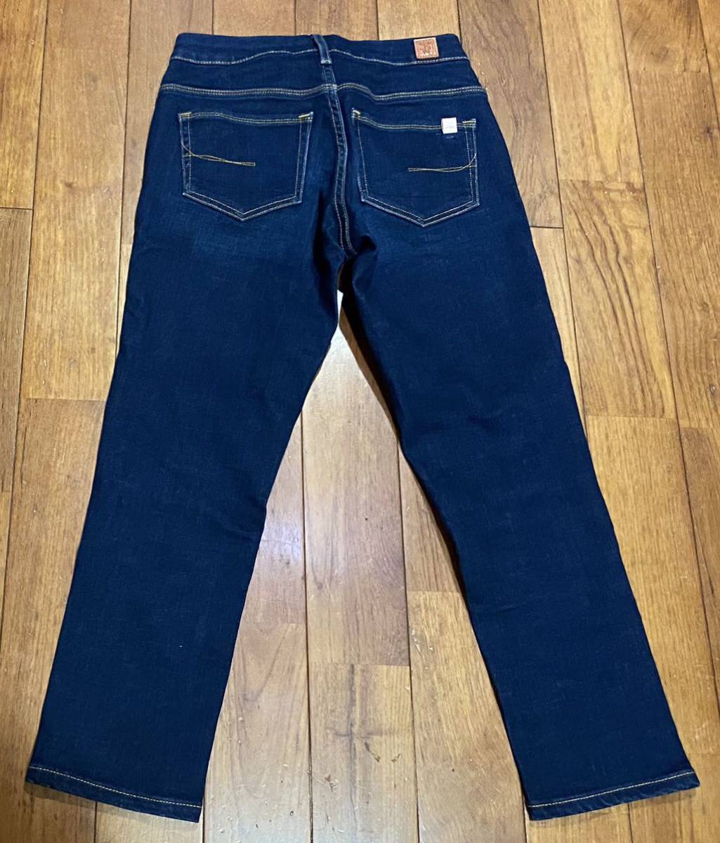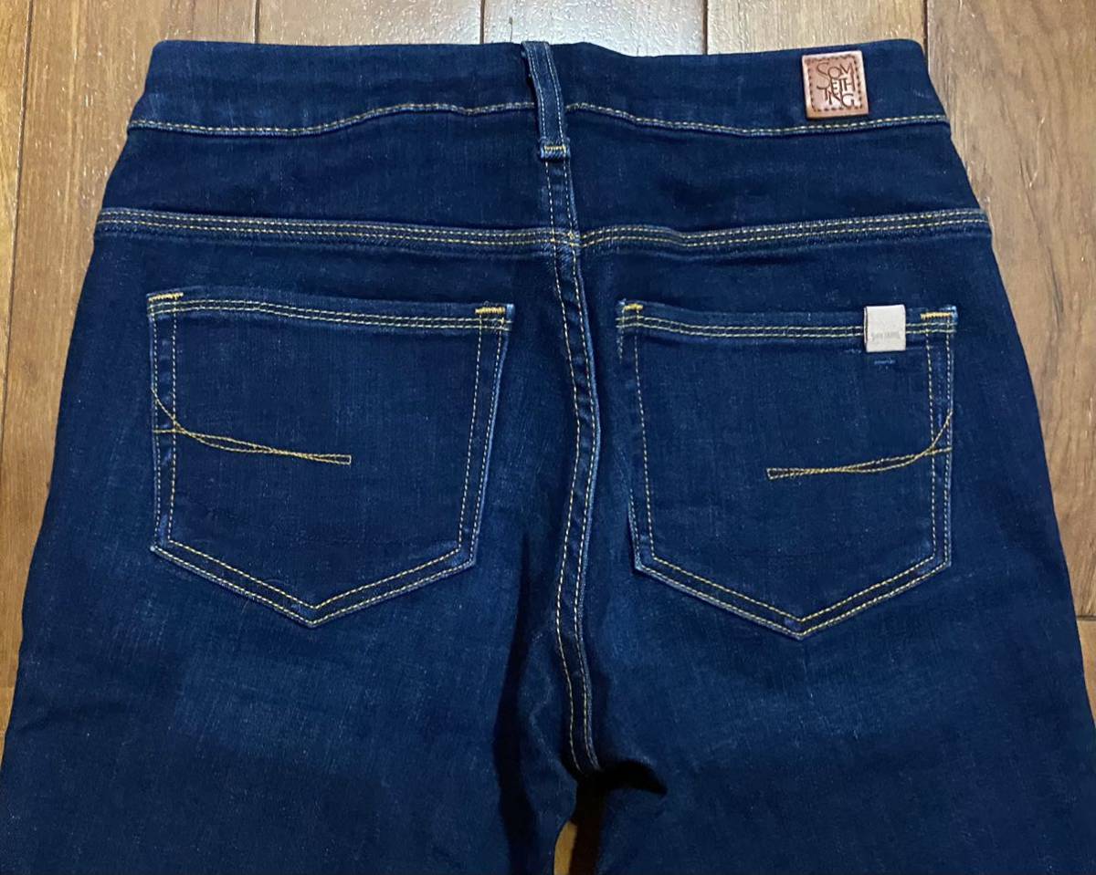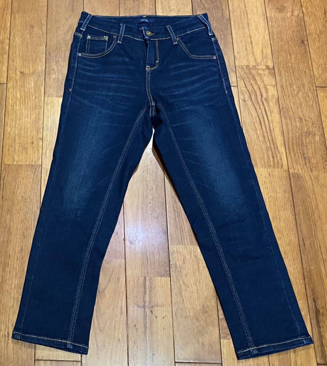 サムシングのストレッチカプリデニム(ジーンズ)、GS250 EJW-0264 X03-01902です。色はインディゴブルーです。USEDですが状態は良いです(10段階中8程度)。ジッパーフライ、裾はチェーンステッチです。生地はストレッチ入りで綿72%、ポリエステル26%、ポリウレタン2%です。正規品です((株)エドウィン、ベトナム製)。サイズはXSでウエストは重ねずに平置きで約64cm、ヒップ約85cm、股上約22cm、股下約57cm、股下15cmのふともも部分約43cm、裾まわり約30cm、重量約370gです。