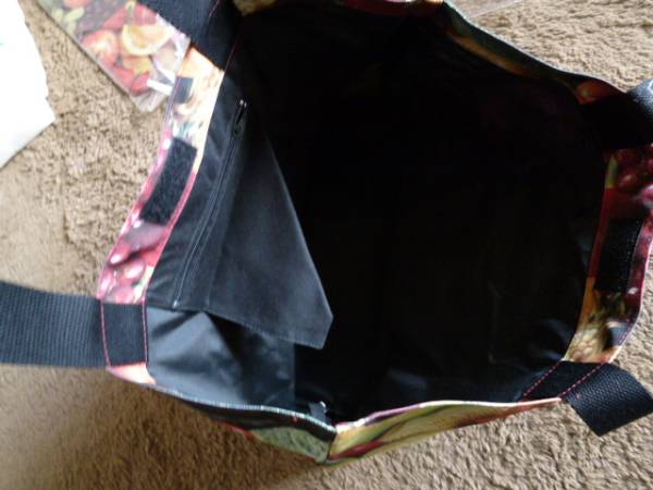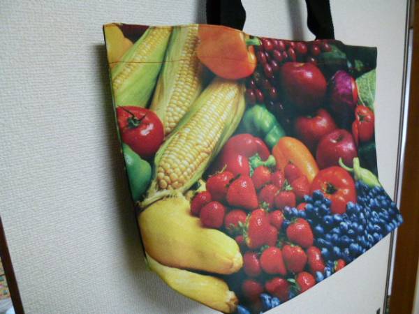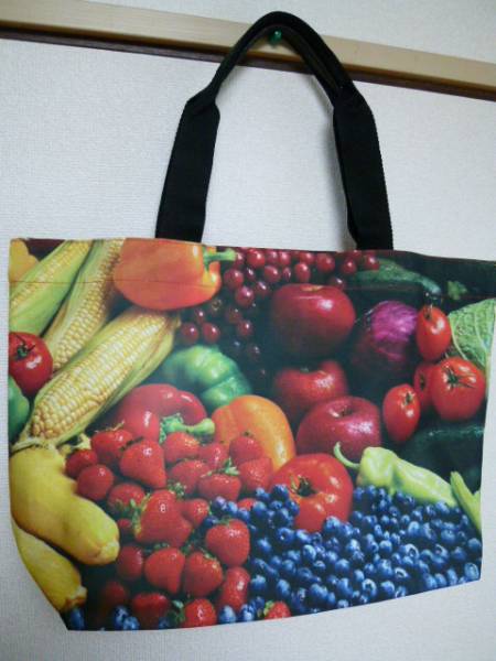 全面にいろいろなフルーツがプリントされたインパクト大のトートバッグです