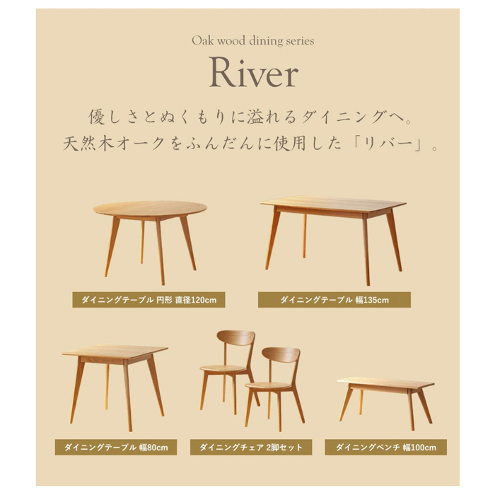 天然木オーク材をふんだんに使用したぬくもり溢れるデザインで、ダイニング空間を優しく包み込むダイニング家具シリーズ「リバー」。