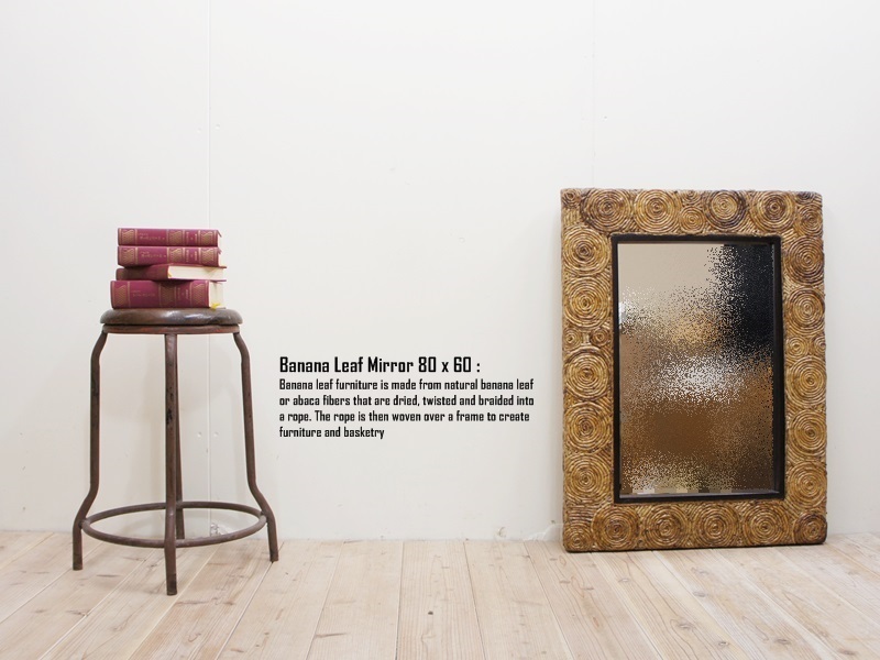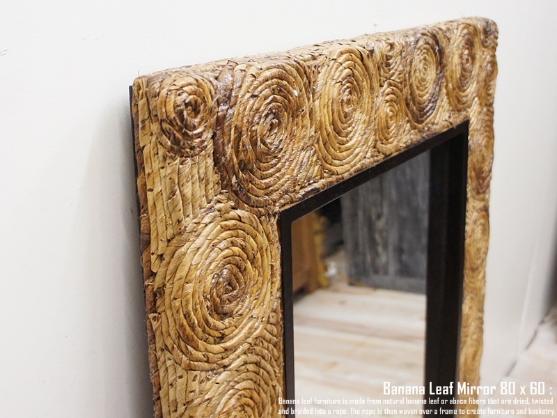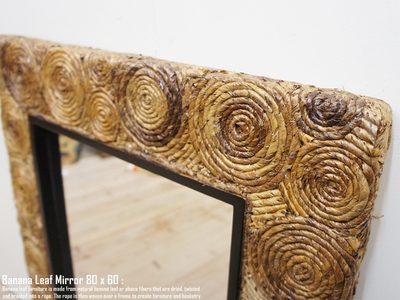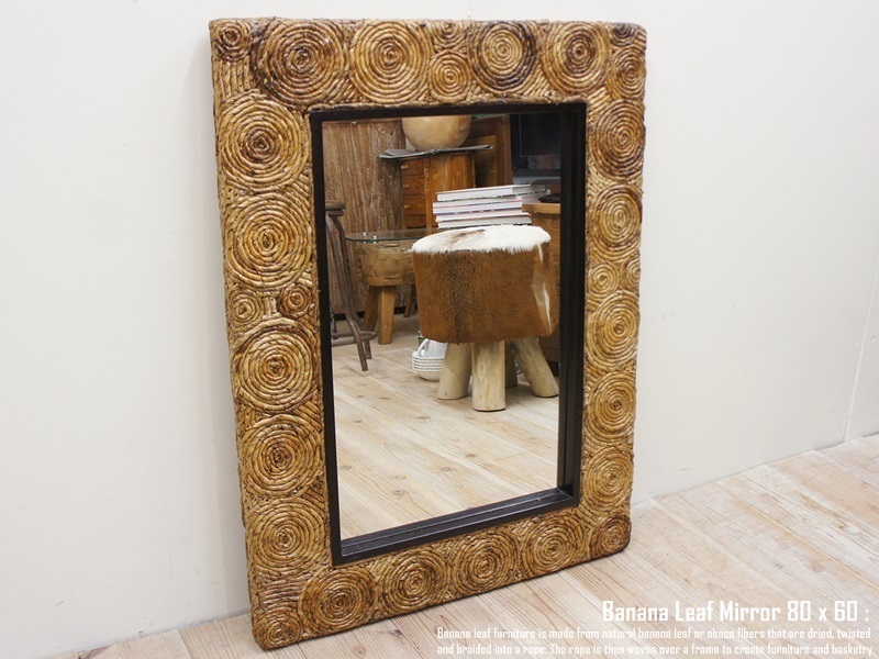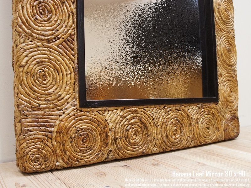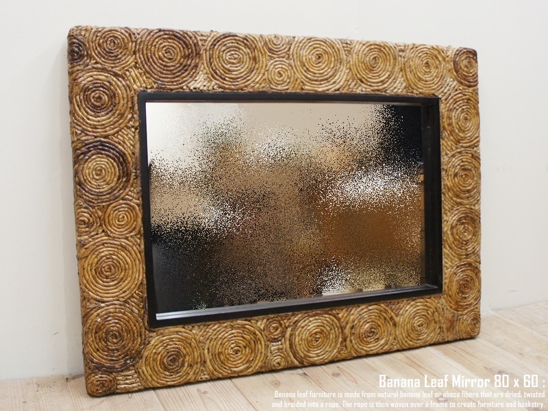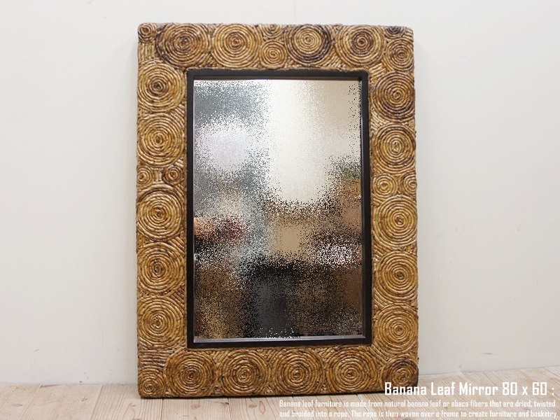 バナナの幹(茎)を乾燥させてねじった素材がフレーム部に幾何学的に施された鏡です。