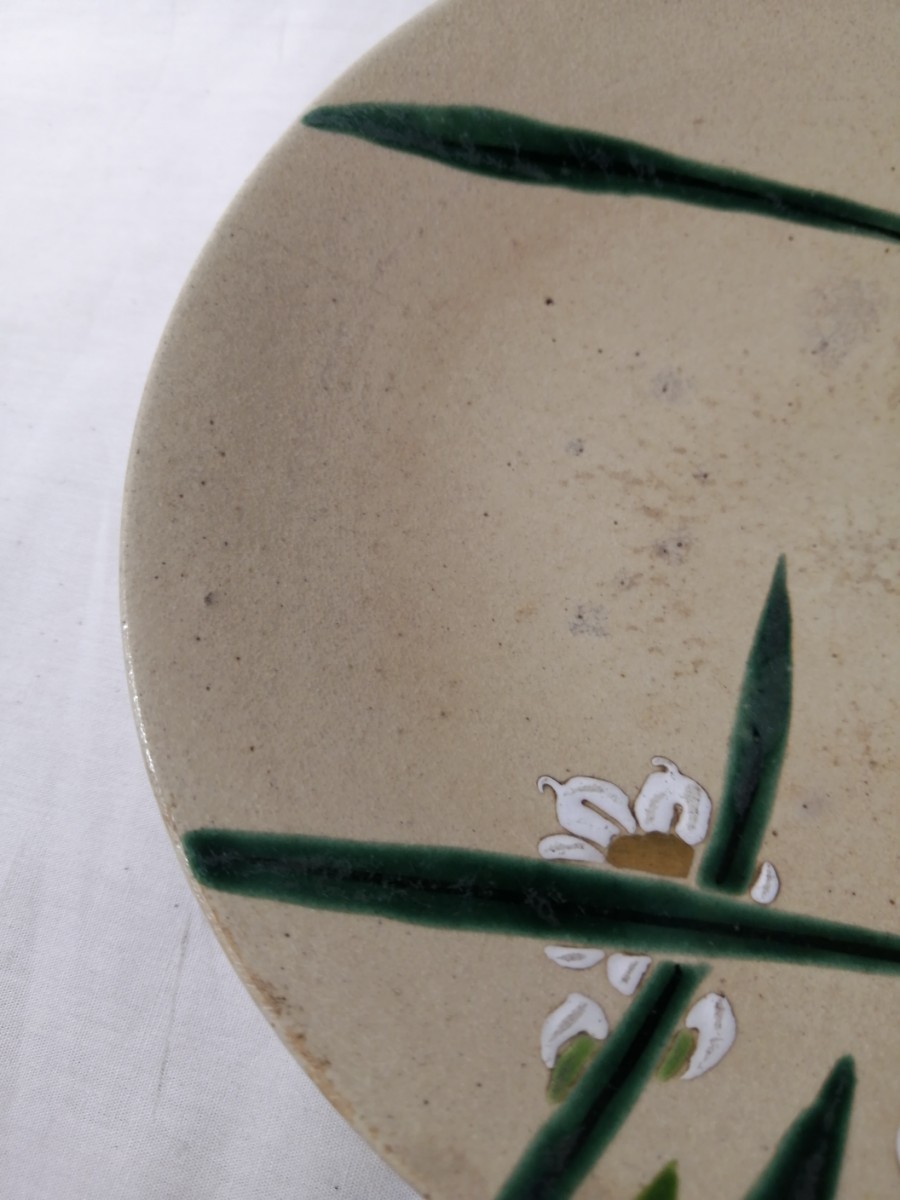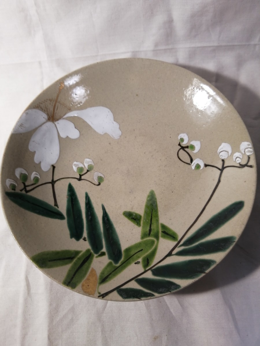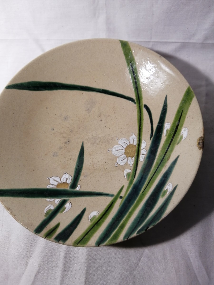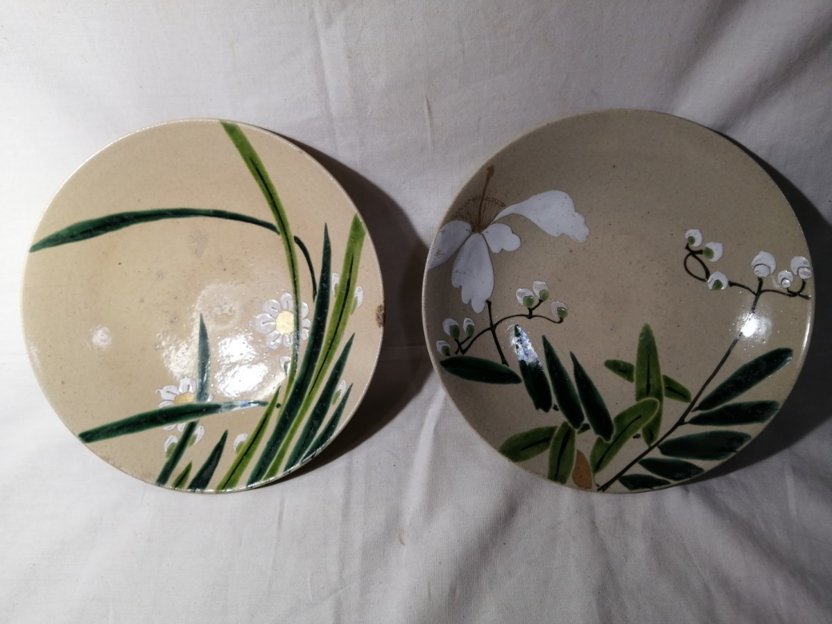 明治頃の京焼(清水焼)と思われるお皿二枚です。野の花がやや盛り上がった状態で絵付されています。裏に銘があり[永楽]と読めます。ソギやホツレの直しがあります。
