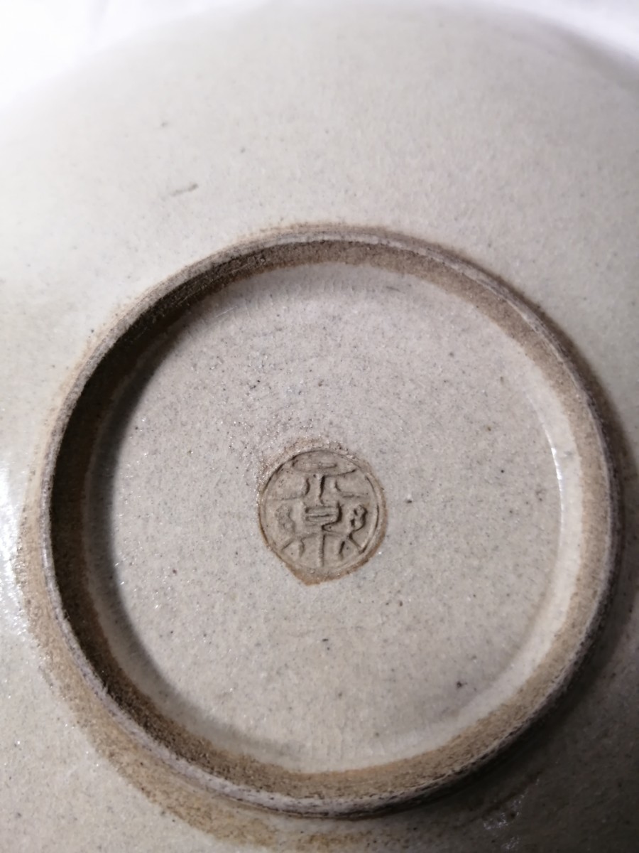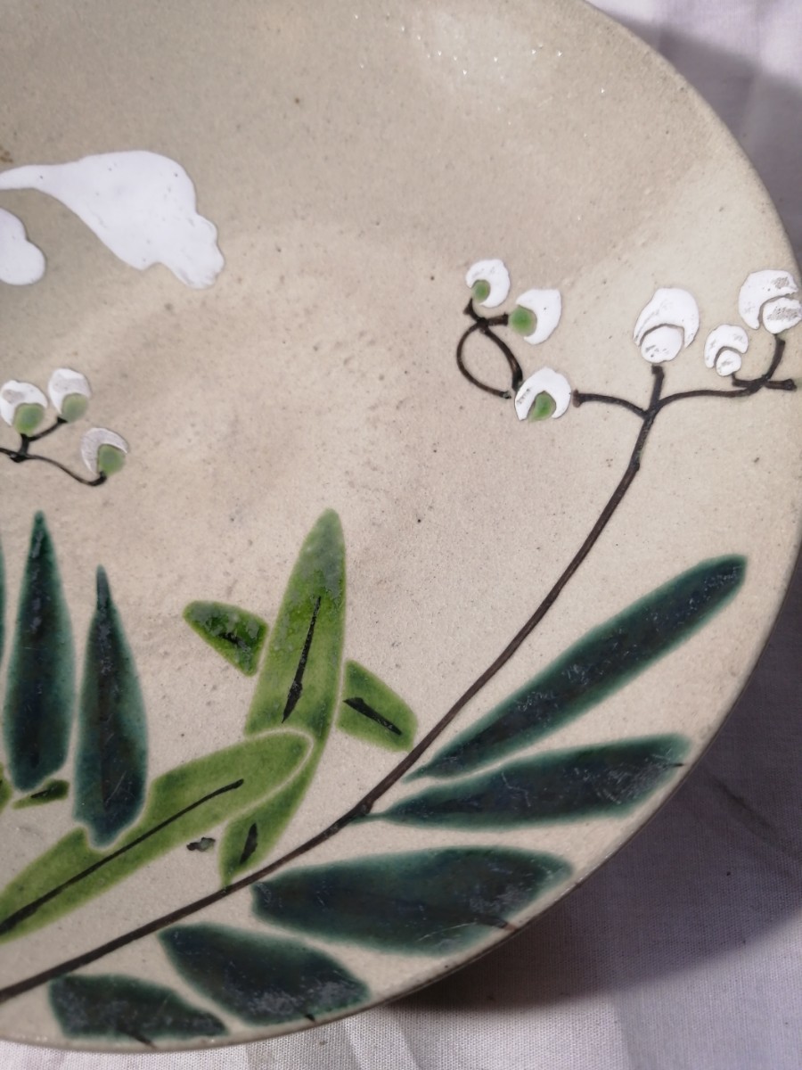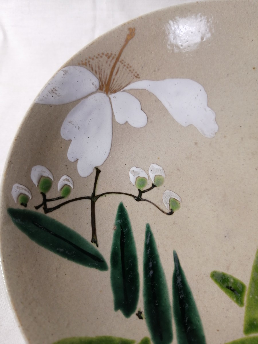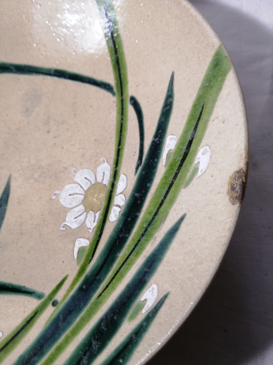 明治頃の京焼(清水焼)と思われるお皿二枚です。野の花がやや盛り上がった状態で絵付されています。裏に銘があり[永楽]と読めます。ソギやホツレの直しがあります。