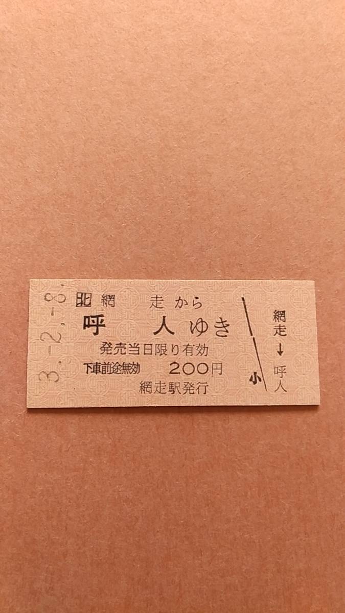 JR北海道 石北本線 網走から呼人ゆき 200円 網走駅発行