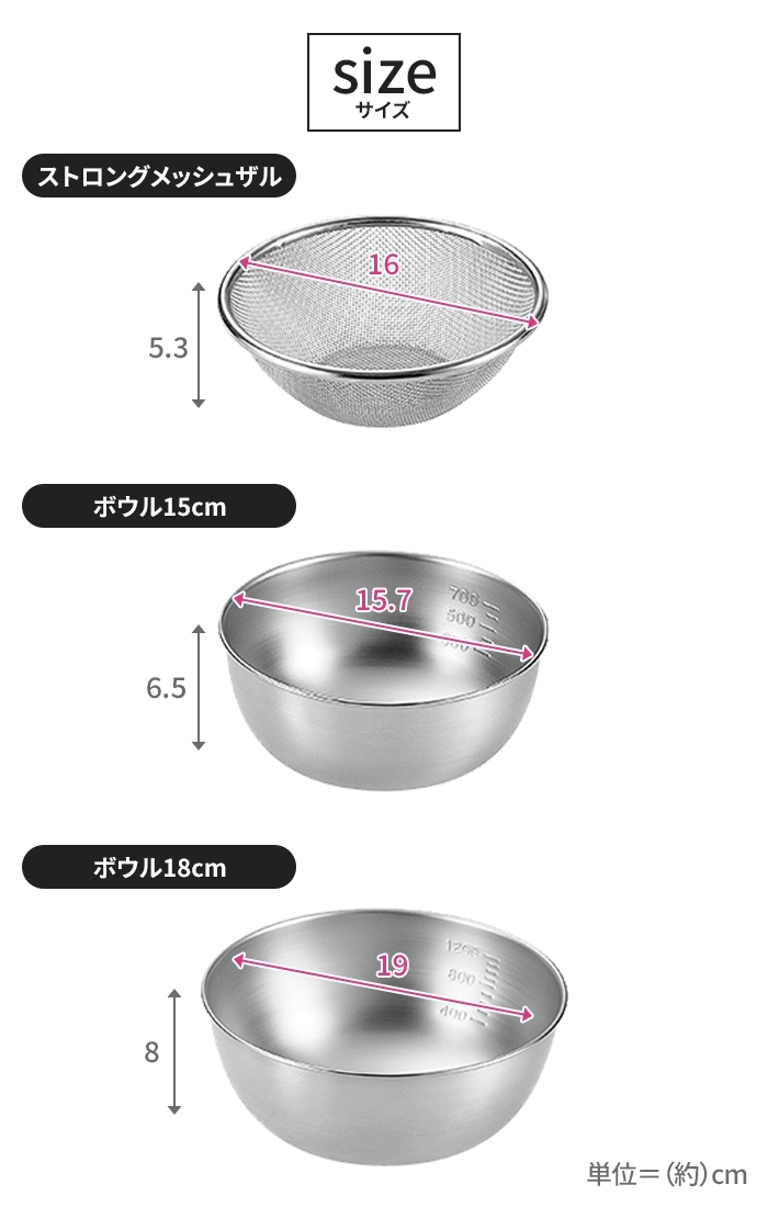 | [メッシュザル16cm]約幅φ16×H5.3cm [ボウル15cm]約幅φ15.7×H6.5cm [ボウル18cm]約幅φ19×H8cm |