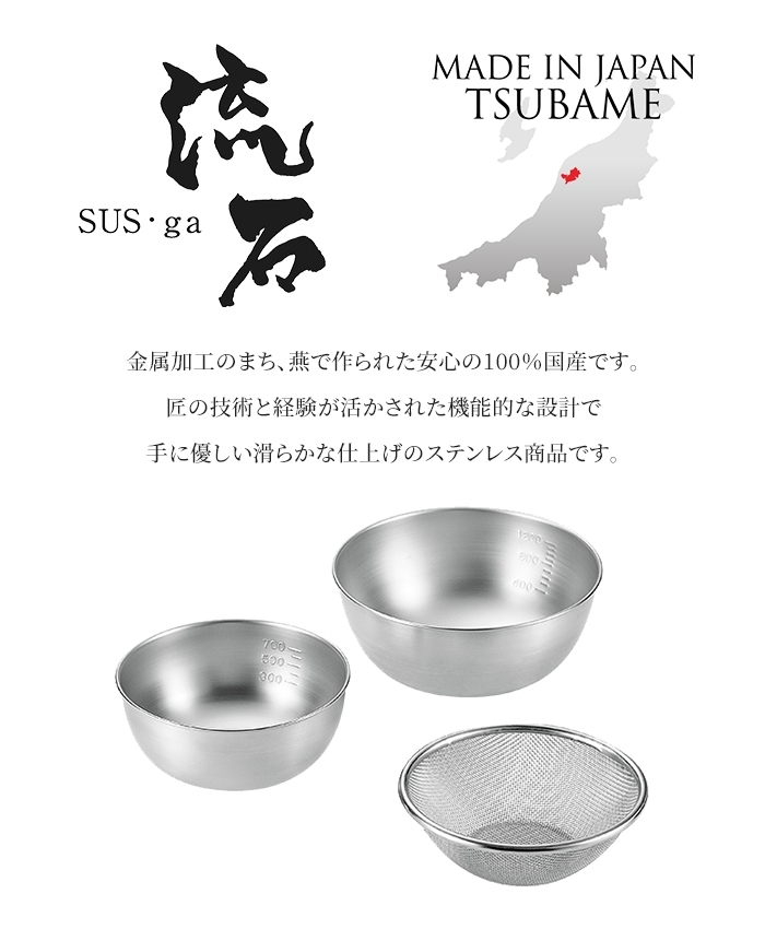 | ー流石ー ~MADE IN JAPAN TSUBAME~ 安心の100%国産! 金属加工の町、燕で作られたメッシュザル16cmサイズ&ボウル15・18cmサイズ3点セットです。 底部の足は一体成型で水切れが良く洗いやすく、外れる心配も無く丈夫です。 通常より太い線材を使用し1インチ(2.54cm)の中に16メッシュで強度をアップしています。 細かいアミ目でそうめんなど細い食材が抜けにくい設計です。 野菜の水切りにも。 ボウルは計量もできる目盛付き。 重ねて収納すれば収納スペースにも困りません。 |