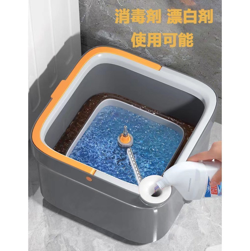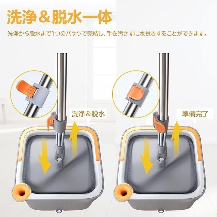 洗浄?脱水一体 洗浄から脱水まで1つのバケツで完結し、手を汚さず衛生的です。マイクロファイバーモップで、水拭きでもから拭きでも、しっかり汚れをキャッチ。遠心力で脱水するので、汚れた水が飛び散りにくく、しっかり脱水できます。