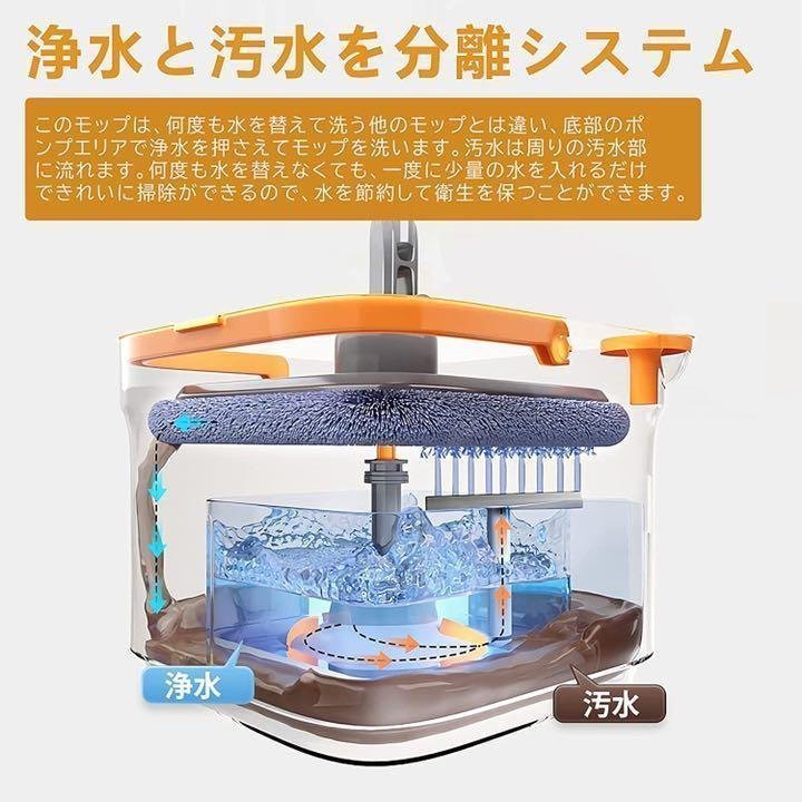 汚水分離 お水と汚水との分離装置あるので、床を拭いたあと、常にきれいな水でモップを洗います。こういう掃除セット一式で、モップの掃除使用や洗浄、脱水まで、手を汚さず、更に高効率、省力、節水や清潔的に掃除を終わらせます。