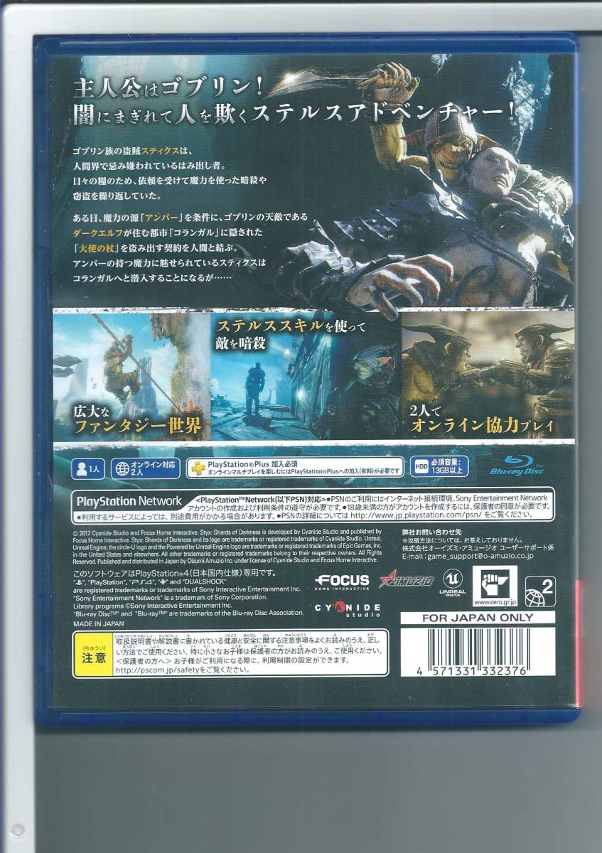 ●JANコード4571331332376 t1 ☆PS4 スティクス:シャーズ・オブ・ダークネス 【CEROレーティング「Z」】 ●商品の状態 ソフトは使用感少なく状態良好ですが、ケースにスレ・イタミがあります。説明書ははじめから付属していません。 |