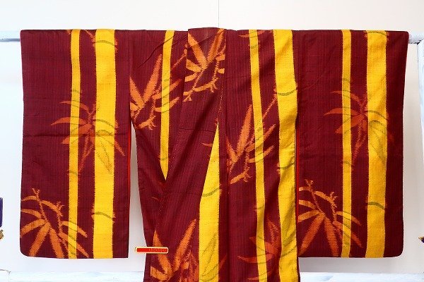 アンティーク 銘仙 赤茶地に笹や竹が描かれた小紋柄の着物です。 ※アンティーク品につきご理解の上ご入札をお願いします。 担当:木山 |