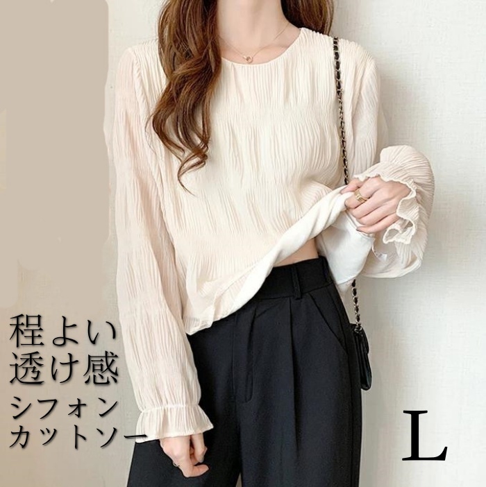 送料無料★新品 程よい透け感 長袖 シフォン カットソー シャーリング フリル トップス レディース★オフホワイト/L | ||||