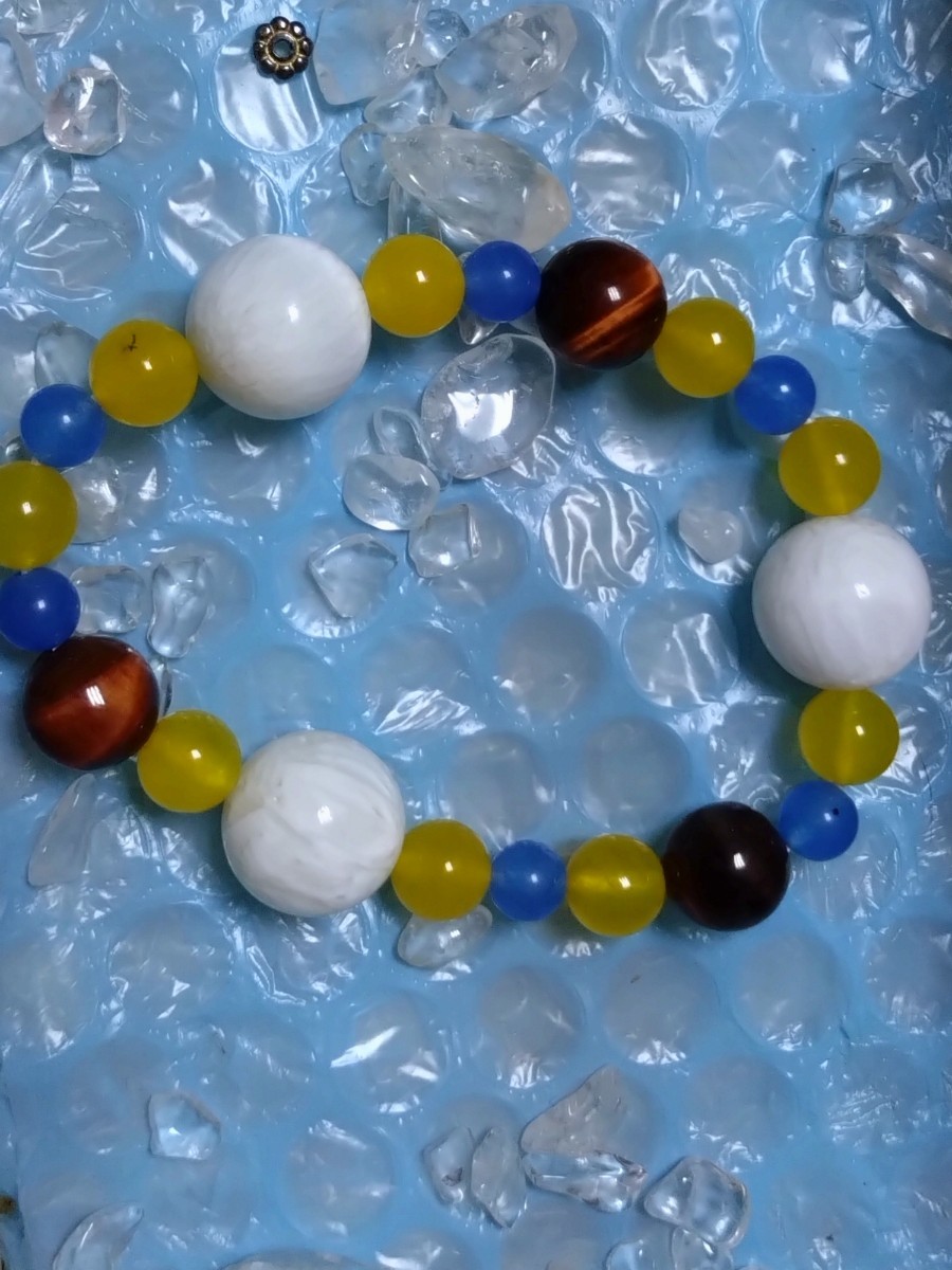 もう使うこともなさそうなので、出品しています。 ホワイトオニキス、タイガーアイ、ルチルクォーツ等その他で作られています。浄化する水晶と満月の光で浄化しています。