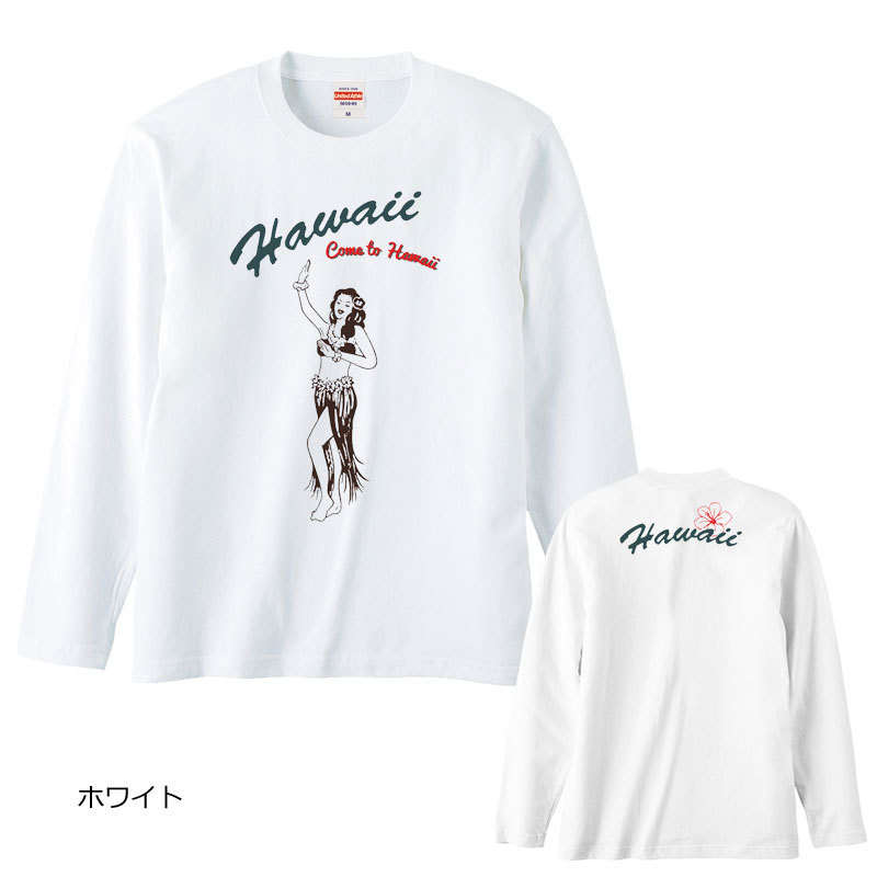 レディースM対応(タグ表記男女兼用S)/ホワイト*Hawaiiダンシングフラガールプリント*長袖/Tシャツ/フラダンス/ハワイ/送料無料【tl096】