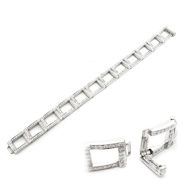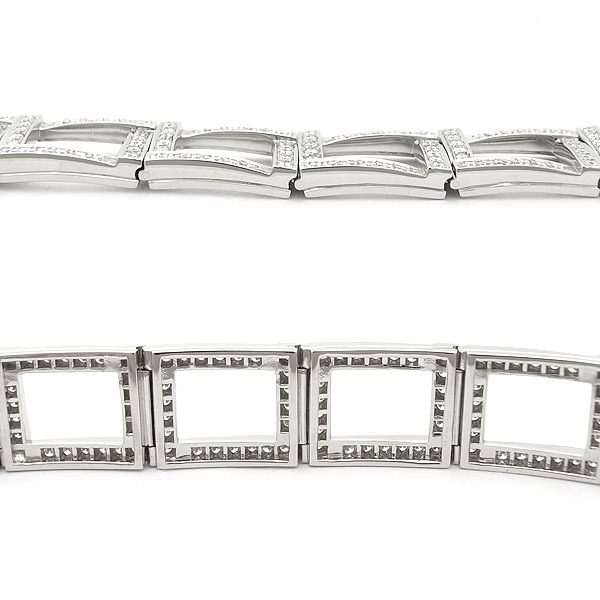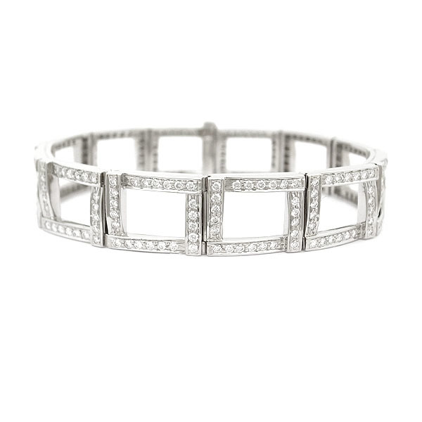 コメント スクエアに縁取られたラウンドブリリアントカットのダイヤモンドとプラチナの深い煌きが女性の肌をさらに美しく見せてくれる特別な品格が備わったエレガントなブレスレット。ティファニーの贅を尽くした逸品。総重量55.7g 緑屋商品番号:1094357